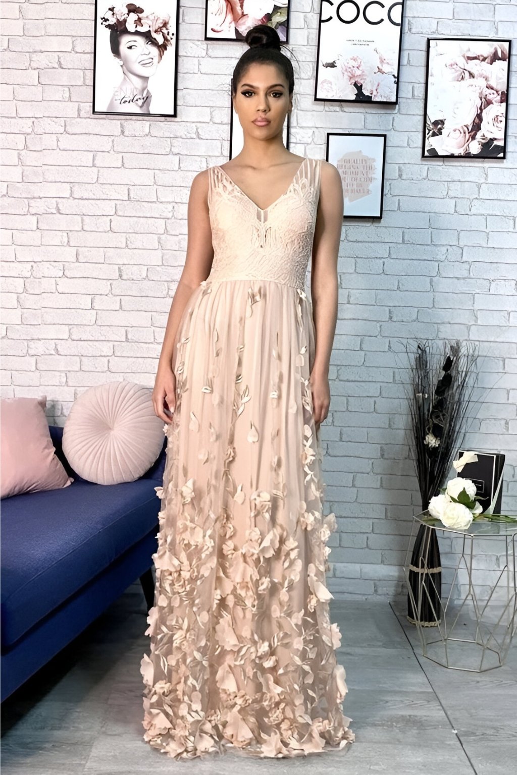 Tieto dlhé béžové šaty pôsobia mimoriadne nežne a elegantne vďaka jemnému čipkovanému vrchu a bohato zdobenej sukni s 3D kvetinovou aplikáciou. Úzky strih na ramienka krásne zvýrazňuje dekolt aj ramená a zároveň pôsobí vzdušne a žensky. Tento model je ako stvorený na svadbu, ples, spoločenskú udalosť či večeru v elegantnom prostredí.