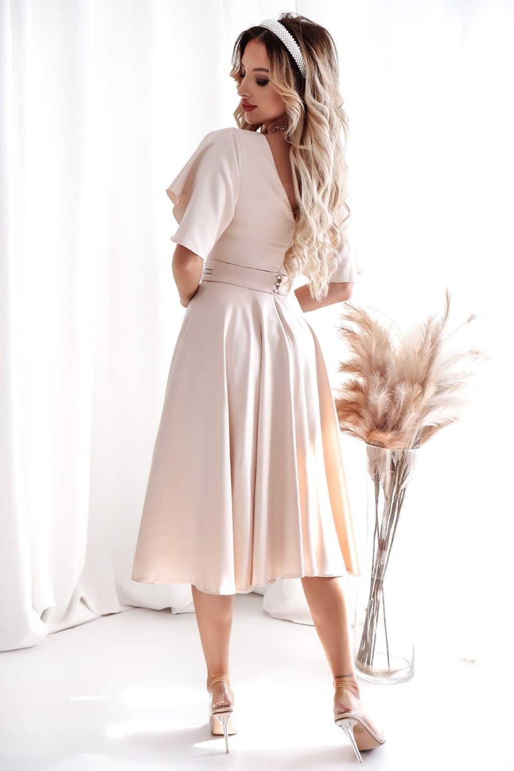 Tieto elegantné midi šaty v jemnom odtieni champagne sú ideálnou voľbou pre každú štýlovú ženu. Vysokokvalitný materiál so splývavou sukňou krásne zvýrazní ženské krivky a zároveň ponúka maximálne pohodlie. Motýlie rukávy a decentný V-výstrih dodávajú šatám romantický nádych, zatiaľ čo pás so zdobeným detailom zvýrazňuje siluetu. Perfektné na svadbu, rodinnú oslavu, krstiny či iné špeciálne príležitosti, kde sa budete cítiť očarujúco a pohodlne zároveň.