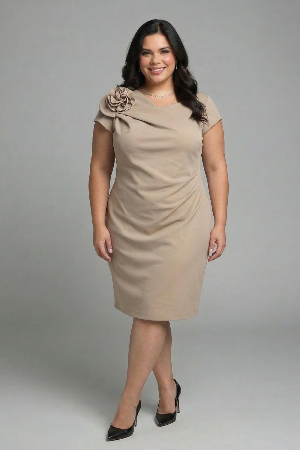 Béžové puzdrové midi šaty s kvetinovou aplikáciou