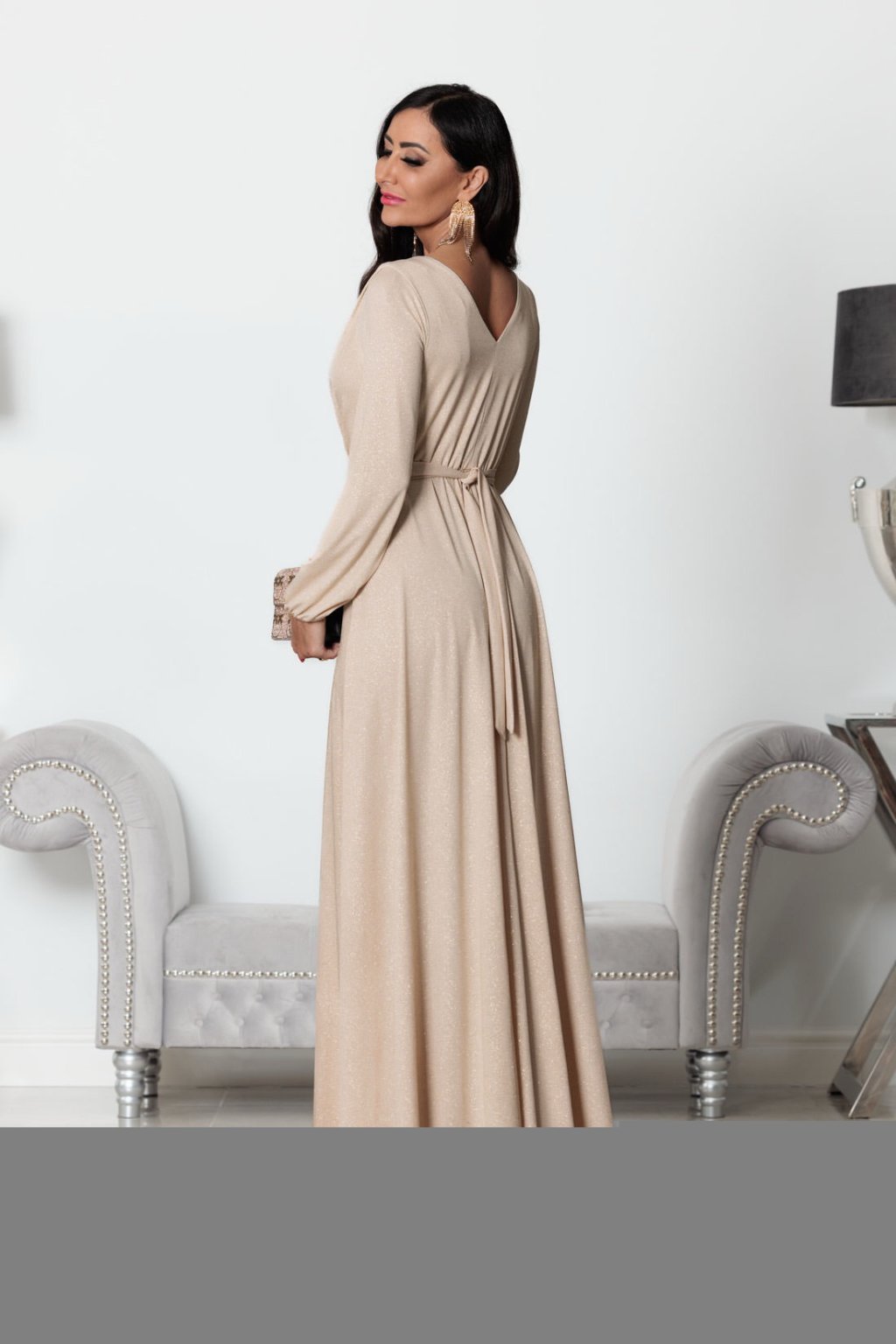 Tieto dlhé zlaté spoločenské šaty s jemným trblietavým efektom sú stelesnením elegancie a luxusu. Model má maxi dĺžku, áčkový strih a sofistikovaný zavinovací vrch s hlbokým V-výstrihom, ktorý zvýrazní dekolt a opticky zoštíhli postavu.