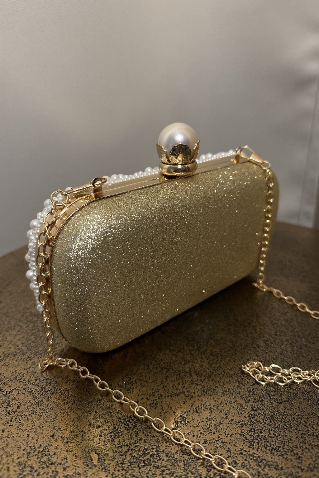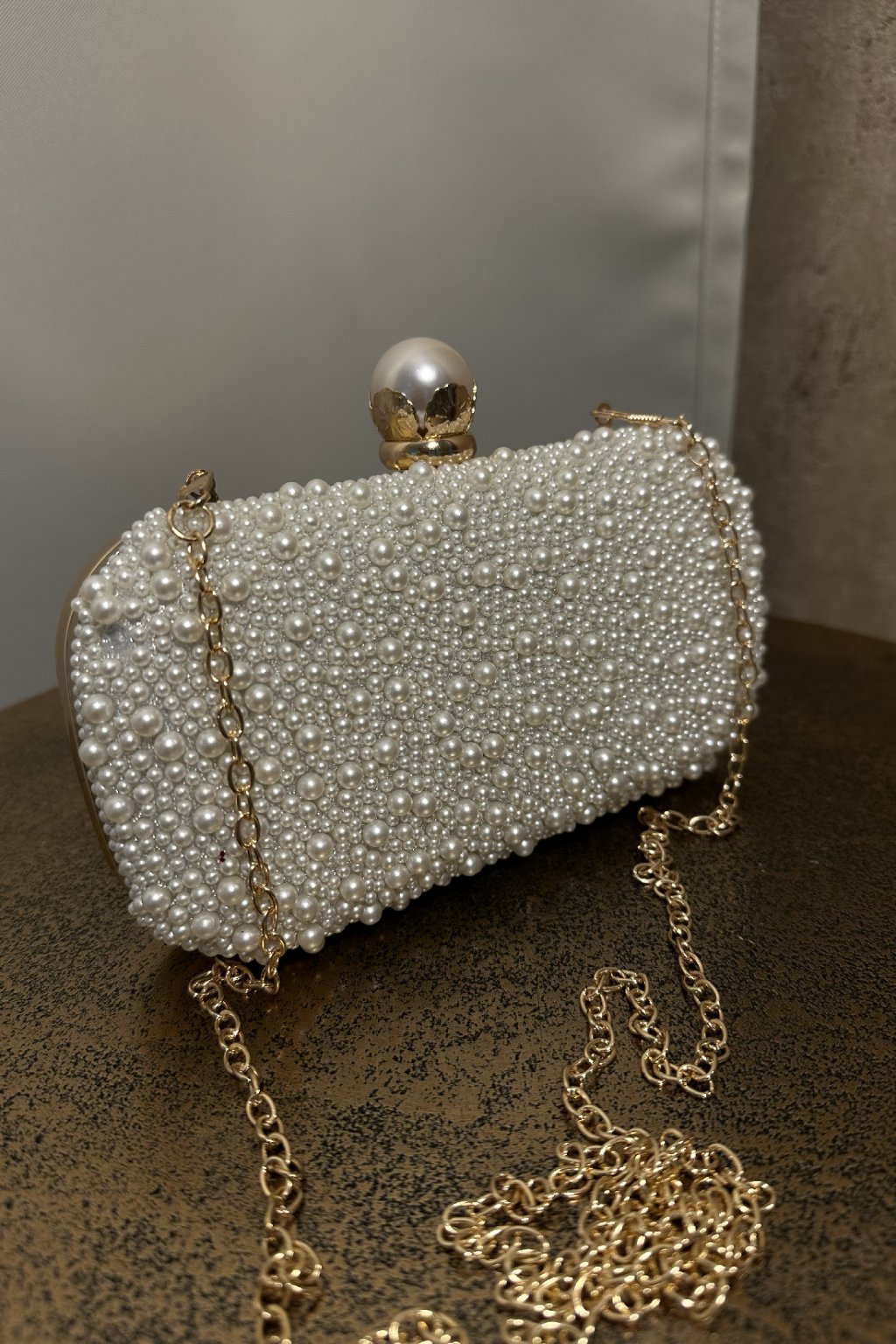 Táto luxusná kabelka s perlami a elegantným zlatým podkladom je dokonalým doplnkom na svadby, plesy a exkluzívne večierky. Jej perlový povrch a štýlové kovové zapínanie dodávajú kabelke jedinečný šarm a eleganciu.