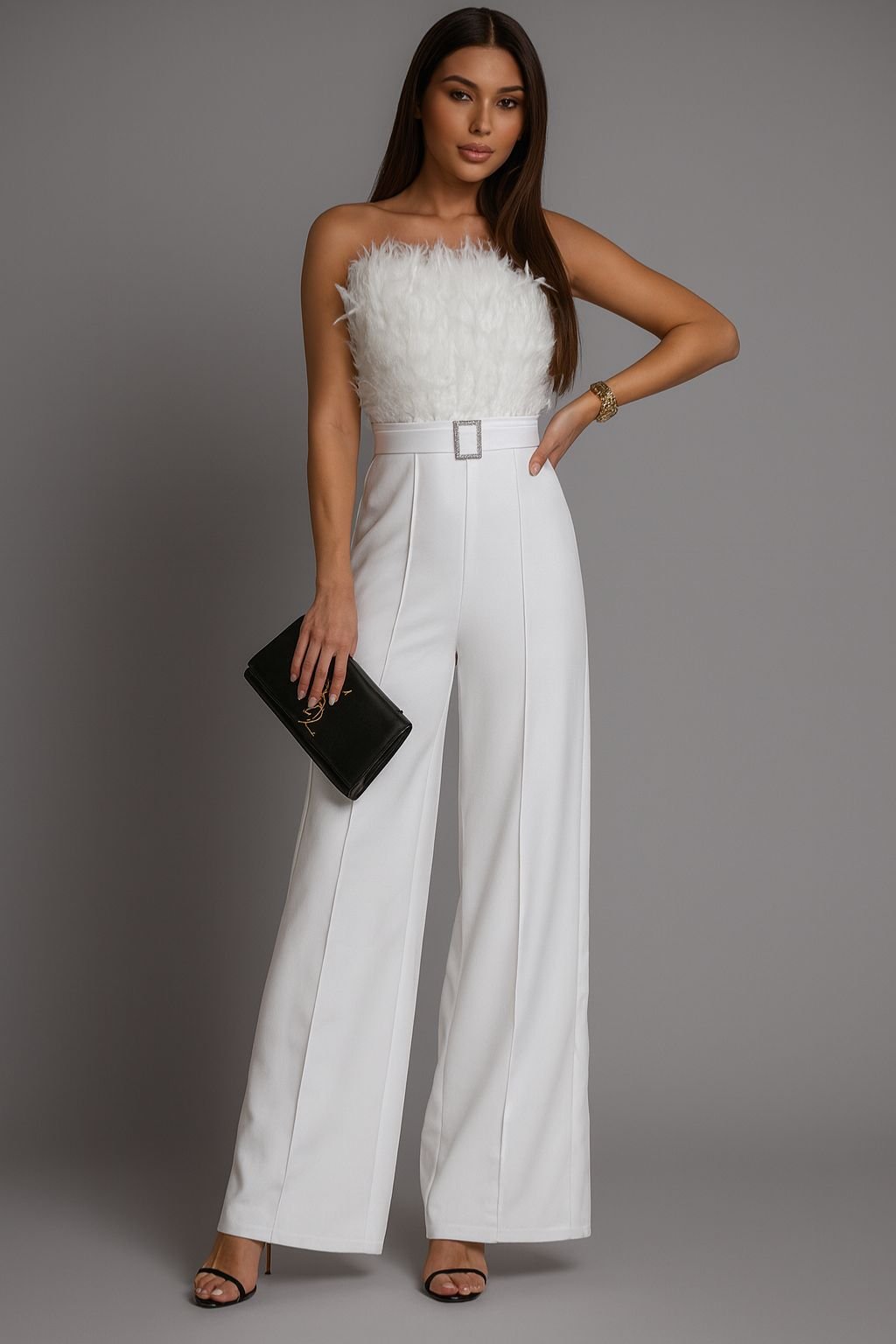 Tento biely elegantný overal bez ramienok s výrazným pierkovým vrchom je ideálnou voľbou na oslavy, alebo pre nevestu, ktorá hľadá modernú alternatívu ku klasickým svadobným šatám. Vysoký pás s odnímateľným opaskom krásne zvýrazní siluetu, zatiaľ čo široké nohavice dodajú celkovému looku štýl a pohodlie. Perfektný na civilný obrad, svadobnú hostinu alebo druhý svadobný outfit, zaujme jednoduchosťou, no zároveň pôsobí luxusne a nevšedne.