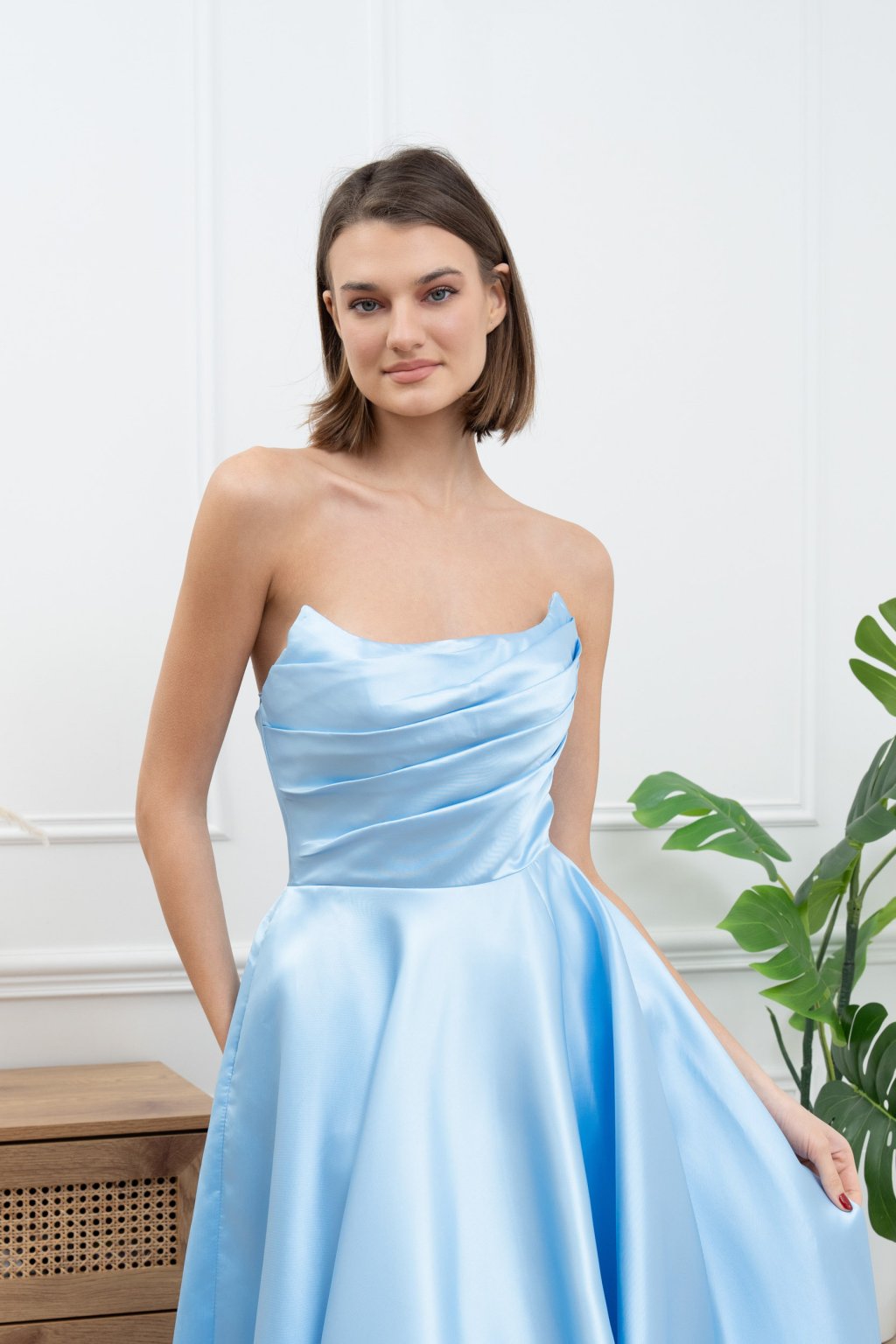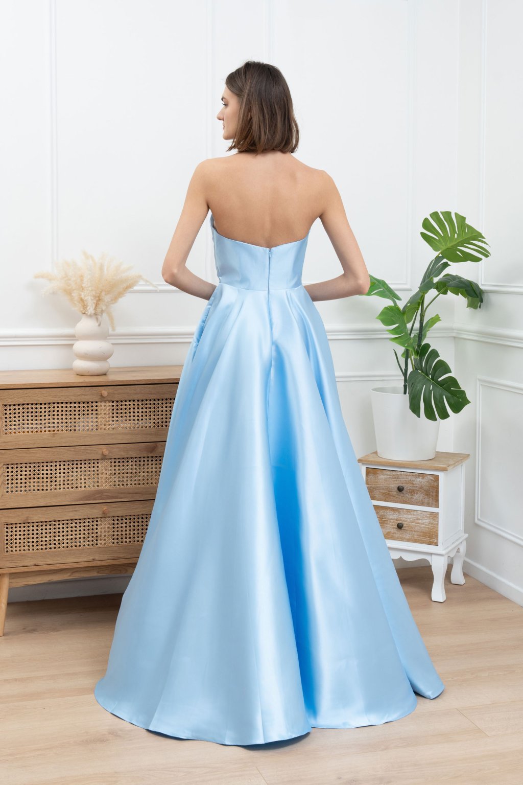 Táto dlhá svetlomodrá spoločenská róba je stelesnením jemnej elegancie a ženskosti. Hladký saténový materiál, nariasený vrch, výrazný rozparok na sukni a praktické vrecká z nej robia kombináciu štýlu a komfortu. Súčasťou sú aj pripínateľné ramienka, ktoré zabezpečia väčšiu istotu a flexibilitu pri nosení – ideálna voľba na ples, stužkovú, ako popolnočné šaty či na svadbu ako hosť.