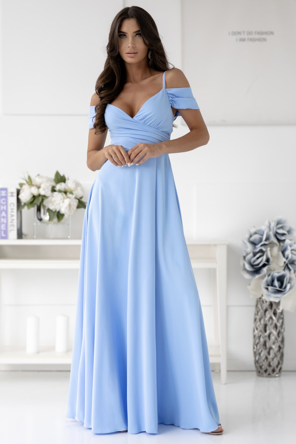 Tieto dlhé bledomodré spoločenské šaty sú dokonalou kombináciou elegancie a romantiky. Zavinovací vrch s jemným riasením krásne tvaruje dekolt, zatiaľ čo odhalené ramená s padavými rukávmi dodávajú šatám ženský a sofistikovaný vzhľad. Splývavá sukňa s jemným rozparkom zabezpečuje pohodlie a ladný pohyb. Ideálne na svadbu, ples, stužkovú či elegantný večierok, kde budete vyzerať neodolateľne a sebavedomo.
