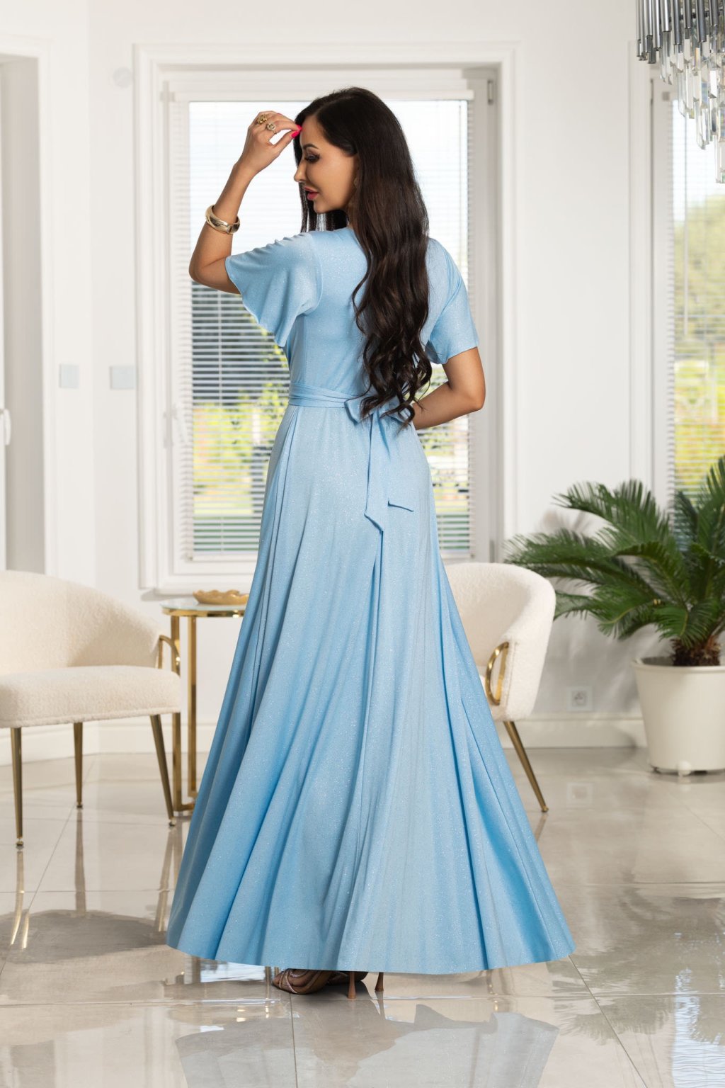 Elegantné dlhé bledomodré spoločenské šaty z trblietavej látky pôsobia luxusne. Výstrih do V, motýlie rukávy a dizajn s opaskom a gumičkou v páse krásne tvarujú postavu a dodávajú pohodlie, zatiaľ čo rozparok zvýrazní ženskosť. Ideálne na stužkovúples, svadbu, oslavu či večierok.