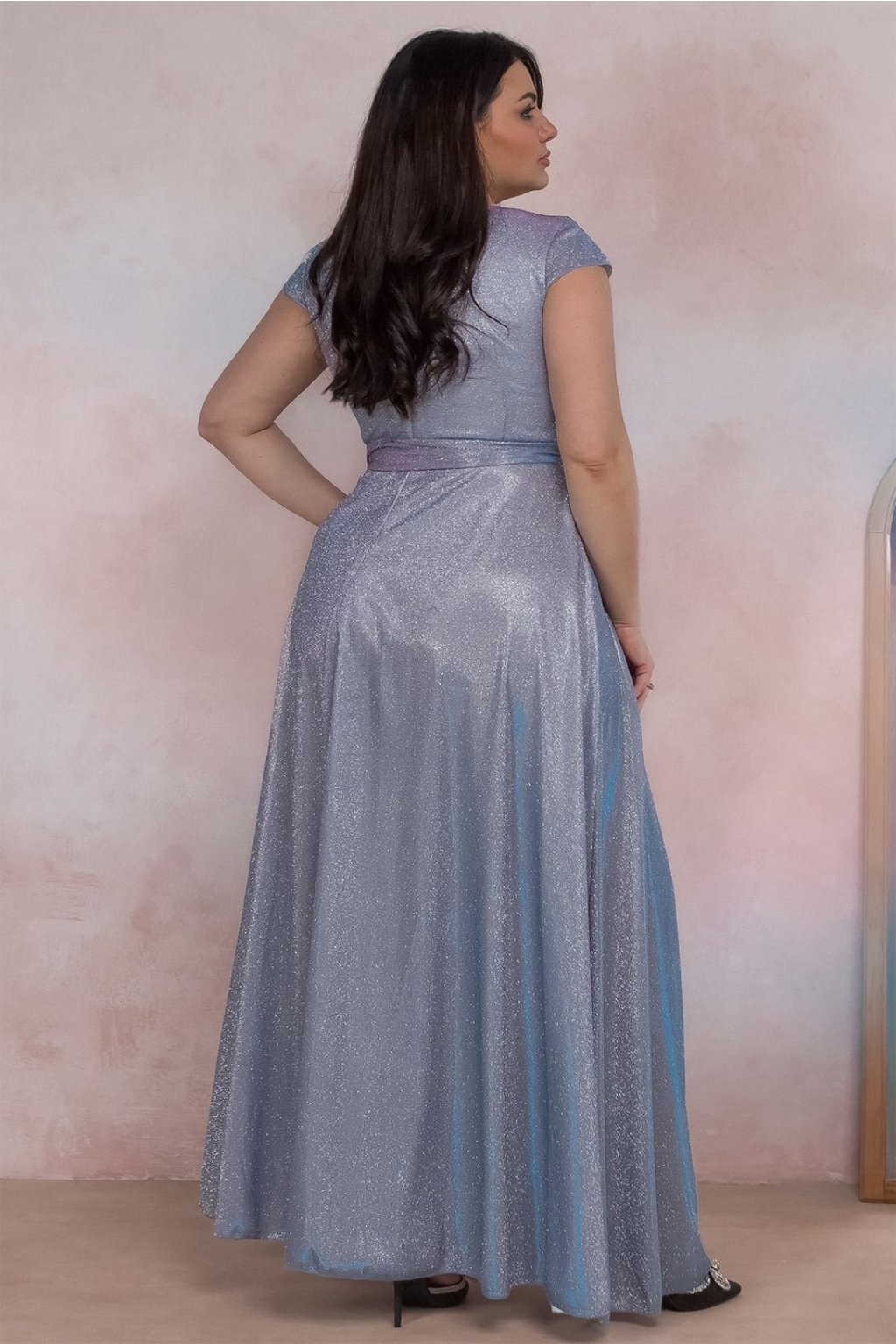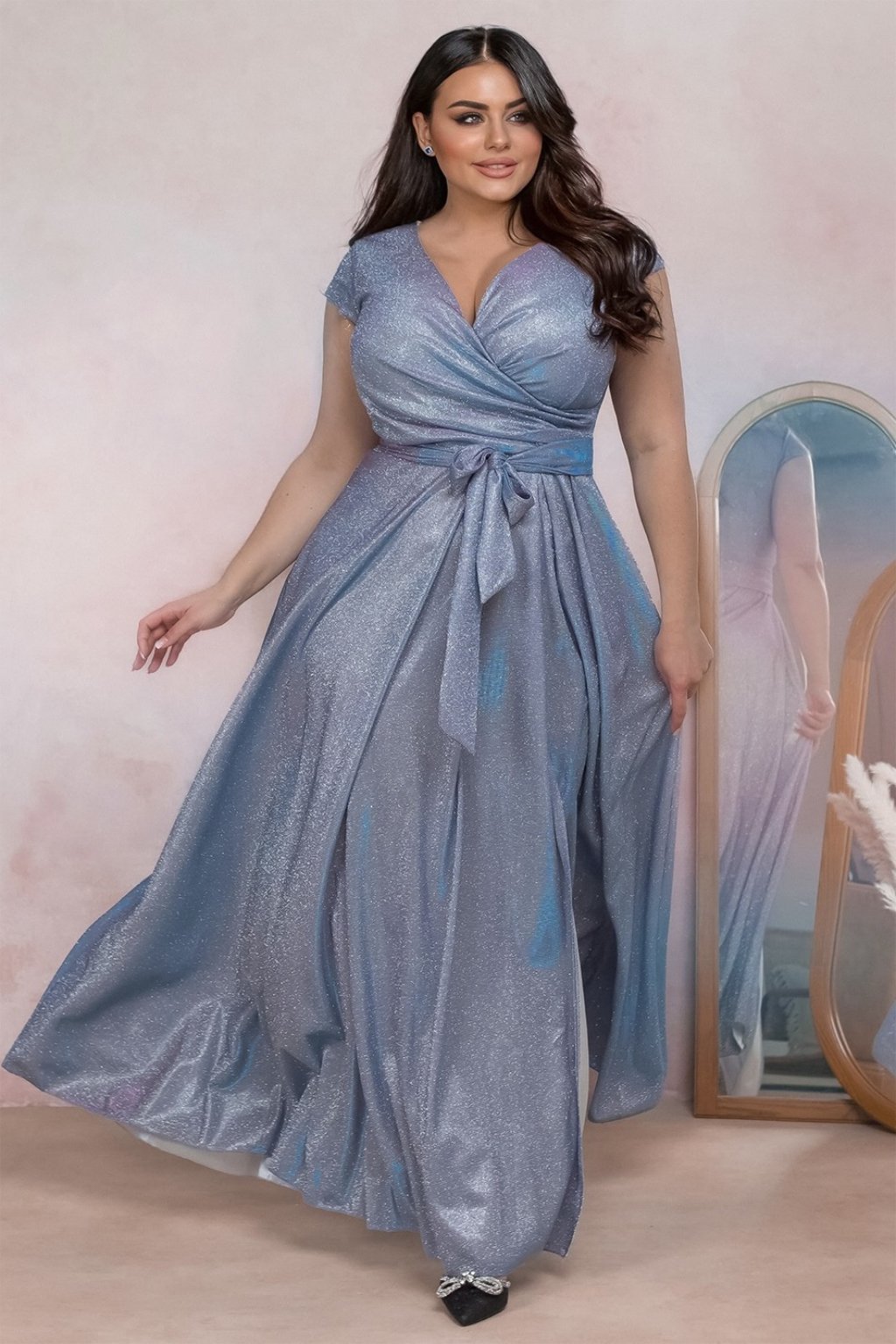 Elegantné trblietavé plus-size spoločenské šaty pre moletky v bledomodrom odtieni sú ideálnou voľbou pre ženy, ktoré hľadajú elegantné šaty na špeciálne príležitosti. Zavinovací vrch s krátkym rukávom a viazanie v páse lichotí postave a opticky ju zoštíhľuje. Dlhá áčková sukňa s rozparkom pôsobí žensky a elegantne – perfektné na ples, svadbu, stužkovú alebo oslavu.