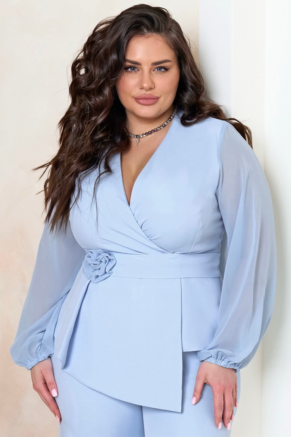 Elegantný dámsky spoločenský komplet v bledomodrej farbe je ideálnou voľbou pre ženy, ktoré hľadajú štýlový outfit na svadbu, oslavu, rodinnú slávnosť, večierok alebo elegantné spoločenské podujatie. Komplet pozostáva z elegantnej blúzky s prekladaným výstrihom a dlhými šifónovými rukávmi a dlhých nohavíc s rovným strihom, ktoré krásne predĺžia siluetu.