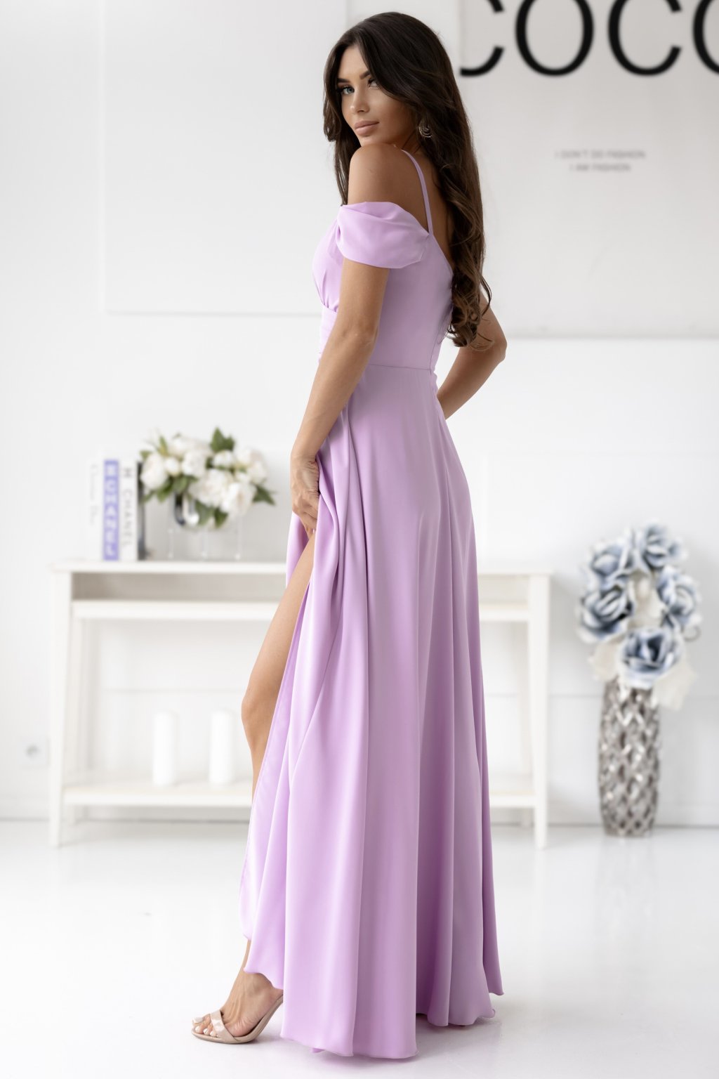 Tieto dlhé bledoružové spoločenské šaty sú dokonalou kombináciou elegancie a romantiky. Zavinovací vrch s jemným riasením krásne tvaruje dekolt, zatiaľ čo odhalené ramená s padavými rukávmi dodávajú šatám ženský a sofistikovaný vzhľad. Splývavá sukňa s jemným rozparkom zabezpečuje pohodlie a ladný pohyb. Ideálne na svadbu, ples, stužkovú či elegantný večierok, kde budete vyzerať neodolateľne a sebavedomo.