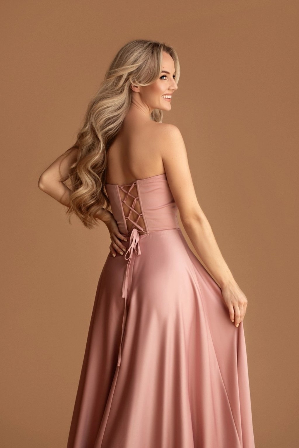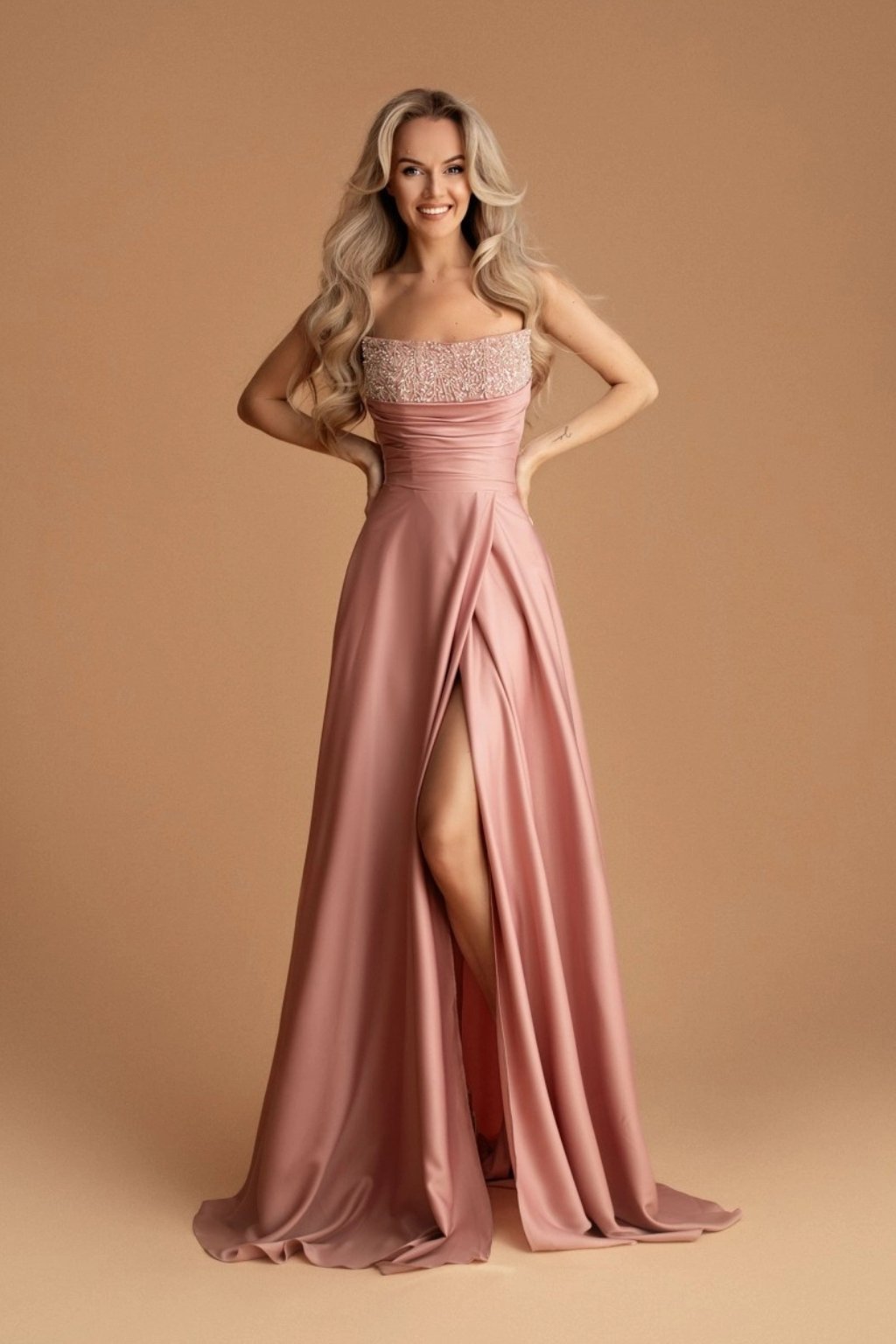 Tieto luxusné dlhé bledoružové spoločenské šaty s odnímateľnými ramienkami očaria na prvý pohľad vďaka trblietavému zdobenému vrchu a elegantnej sukni s rozparkom, ktorá krásne zvýrazní nohy. Vzadu majú praktické šnúrovanie pre dokonalé prispôsobenie postave a k dispozícii sú aj odnímateľné ramienka v rovnakej farbe. Perfektná voľba na ples, stužkovú, svadbu, galavečer alebo večierok, kde chcete pôsobiť sebavedomo a štýlovo.
