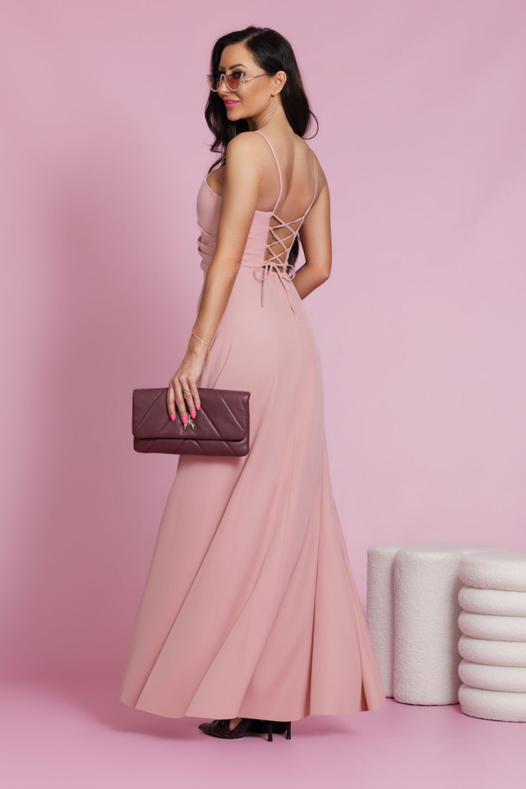 Luxusné bledoružové spoločenské šaty sú stelesnením elegancie. Korzetový top s tenkými ramienkami a zaväzovaním vzadu krásne zvýrazní postavu, zatiaľ čo hlboký rozparok dodáva zmyselnosť. Vyrobené z vysoko kvalitnej látky, ideálne na stužkovú, ples, svadbu alebo večernú spoločenskú udalosť.