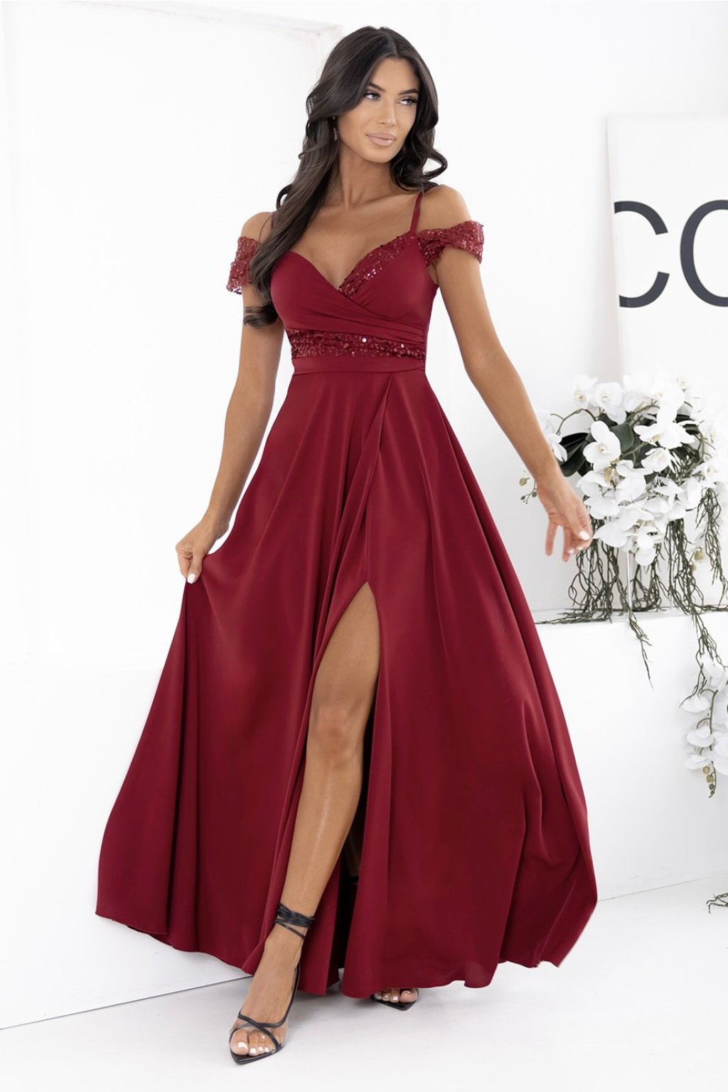 Tieto bordové dlhé spoločenské šaty vynikajú feminínnym priliehavým strihom, ktorý krásne zvýrazní pás a opticky zoštíhli siluetu. V-čkový výstrih jemne podčiarkne dekolt, zatiaľ čo spadnuté krátke rukávy s flitrami a tenké ramienka dodávajú modelu romantický a zároveň elegantný nádych. Ozdobný flitrový pás zvýrazní ženské krivky a dlhá, mierne rozšírená sukňa s vysokým rázporkom pôsobí zmyselne a vzdušne pri každom kroku. Šaty sa zapínajú na skrytý zips na chrbte pre dokonalé prispôsobenie postave.