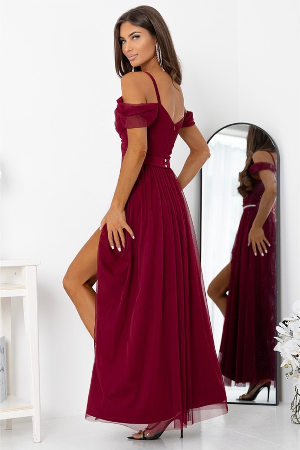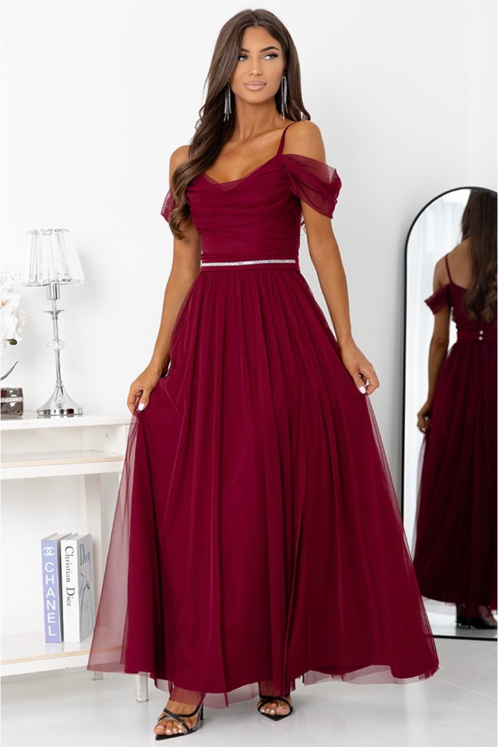 Dlhé bordové spoločenské šaty s elegantným áčkovým strihom a odhalenými ramenami zaujmú svojou ženskou siluetou a jemným padavým materiálom. Vrch šiat je doplnený o tenké ramienka a tylové spadnuté rukávy, ktoré dodávajú modelu romantický nádych, zatiaľ čo zdobený pás s jemnými kamienkami zvýrazňuje pás a predlžuje postavu. Tieto šaty sú ideálnou voľbou na ples, stužkovú, svadbu alebo elegantný večierok, kde chcete pôsobiť štýlovo a neprehliadnuteľne.