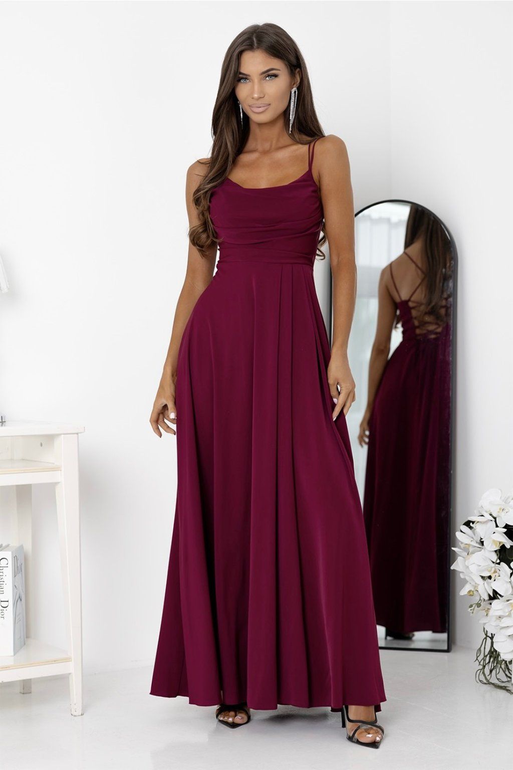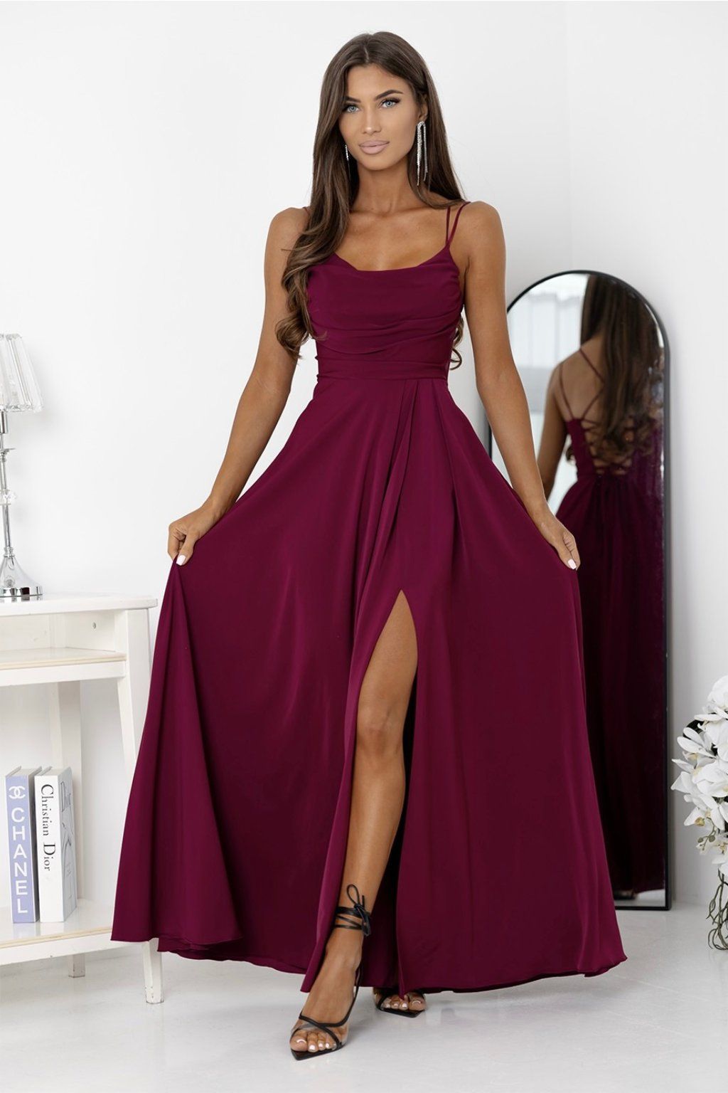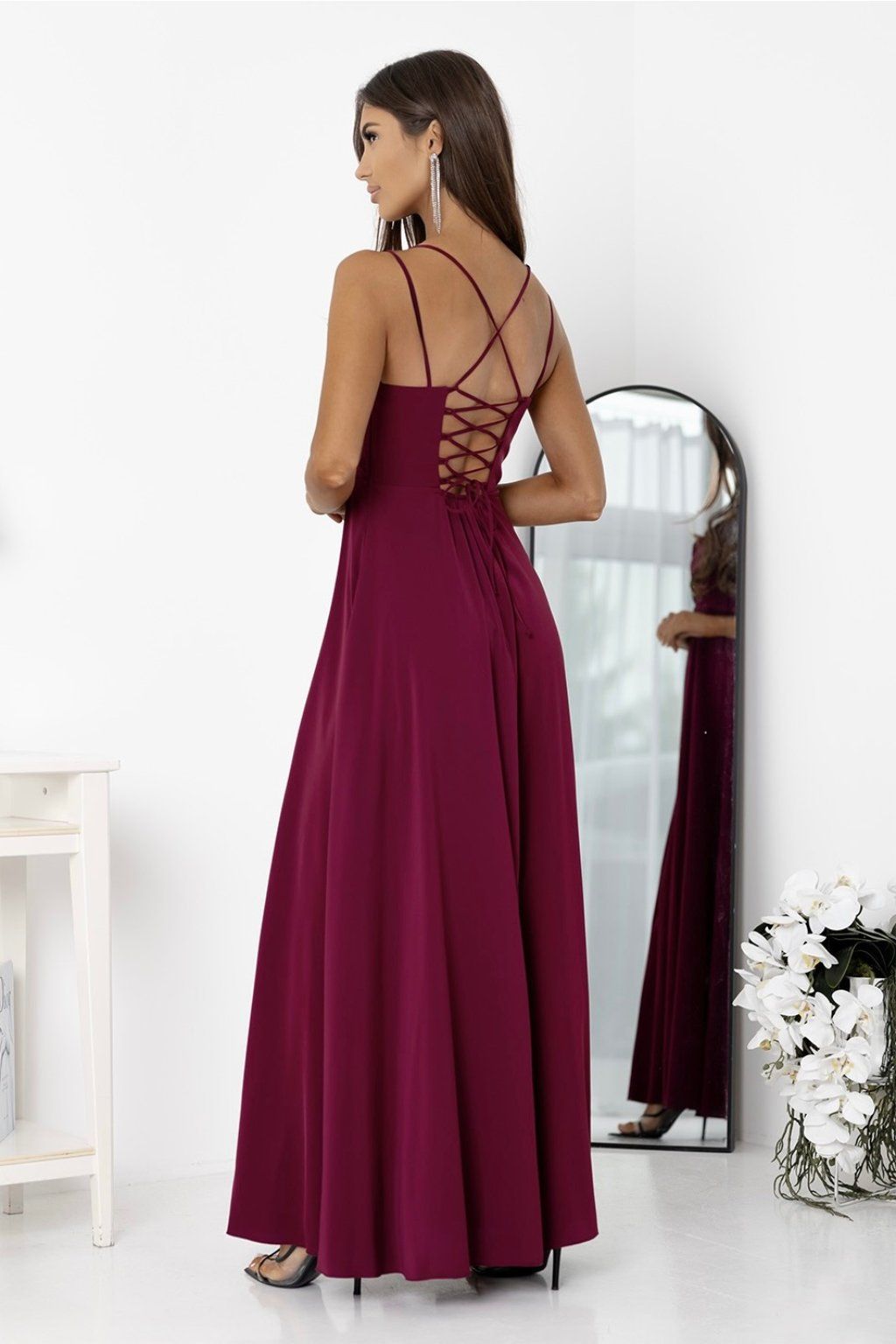 Tieto dlhé vínové spoločenská šaty zaujmú už na prvý pohľad svojím elegantným splývavým strihom a výrazným rozparkom, ktorý dodáva modelu zmyselnosť. Hladký vrch s jemným nariasením a tenké ramienka pôsobia žensky, zatiaľ čo šnurovanie na chrbte umožňuje prispôsobenie šiat postave. Ideálna voľba na ples, svadbu, stužkovú, večierok či elegantnú oslavu, kde chcete zažiariť.