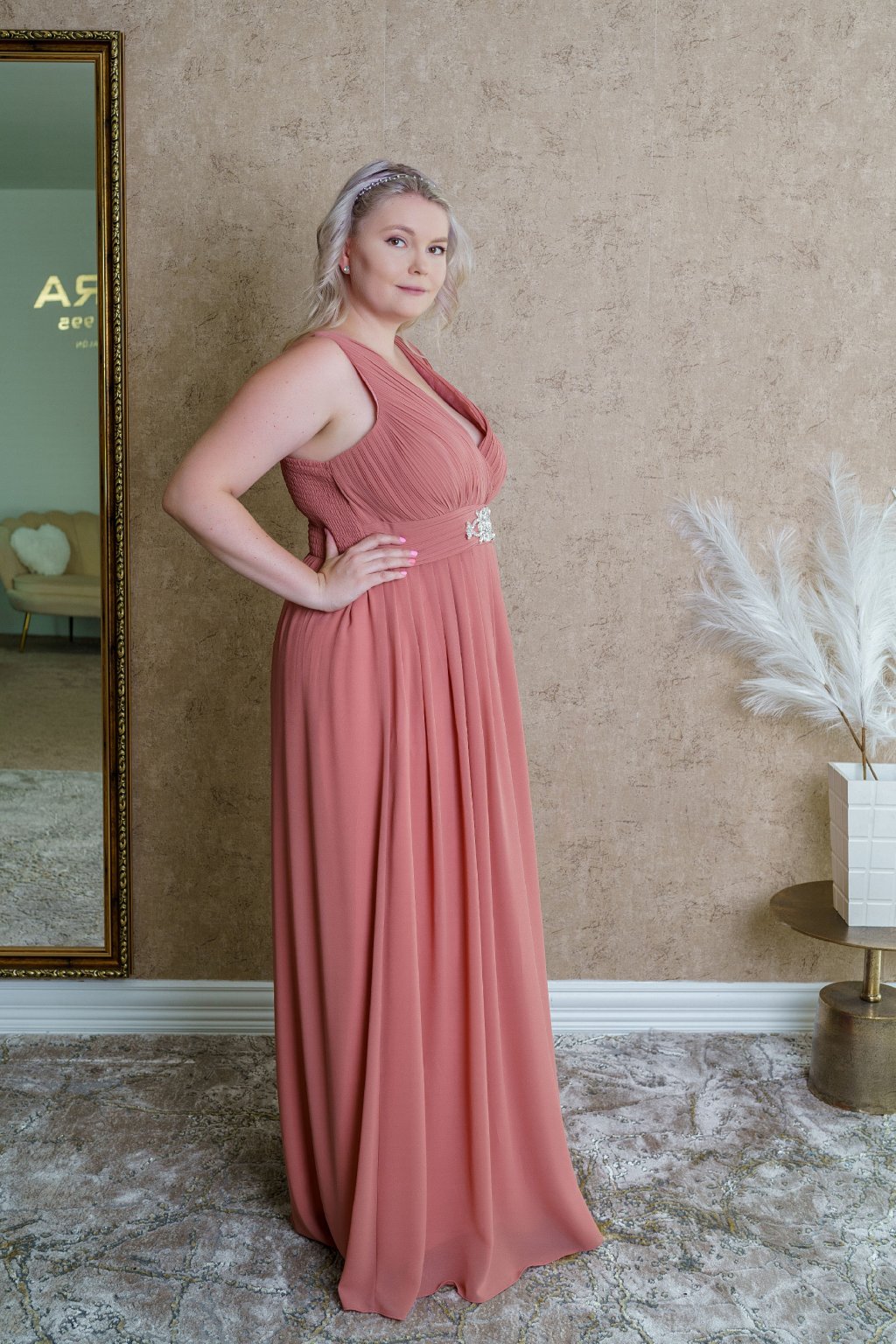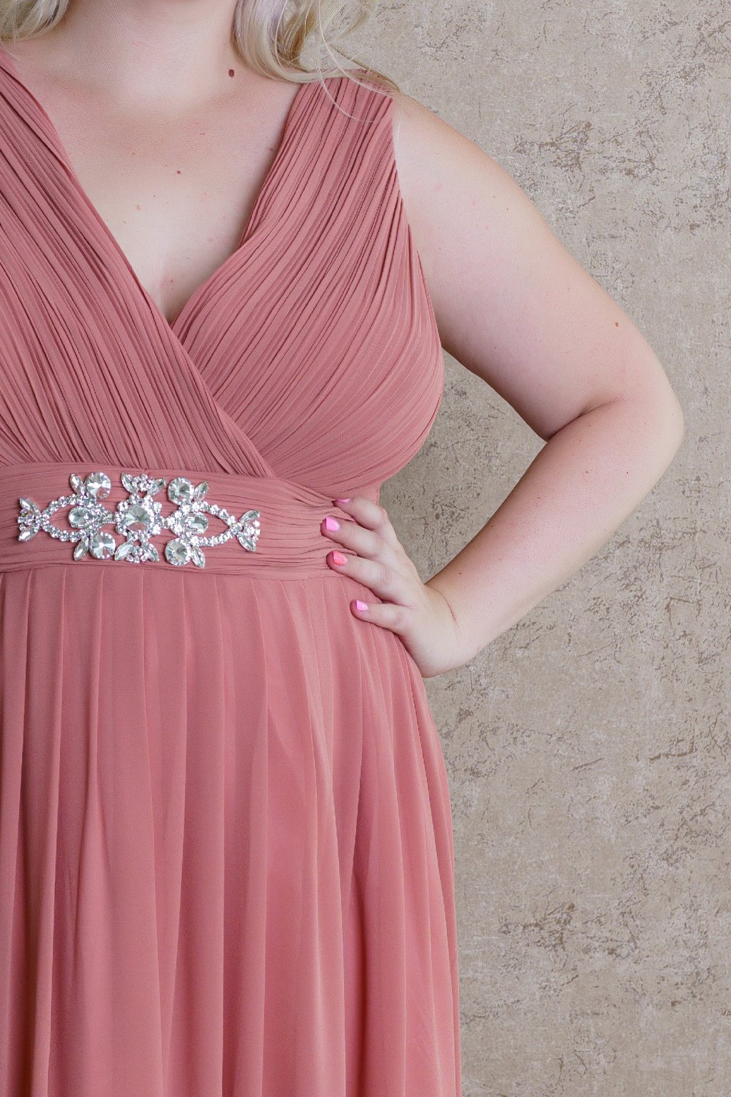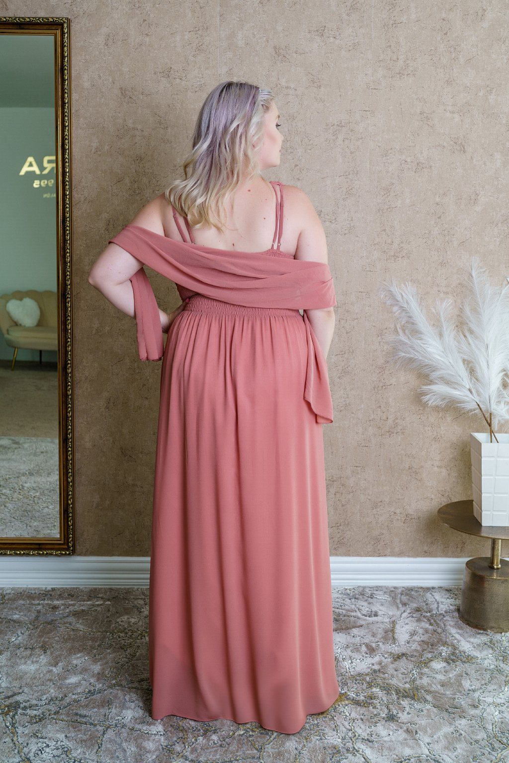 Šaty "Carolina" vďaka svojej jemnej farbe pôsobia veľmi romanticky a nežne, ideálne na slávnostné príležitosti či elegantné večerné podujatia. Ich jednoduchý strih krásne formuje siluetu aj plus-size dámy vďaka opasku obohateného o elegantný detail, pričom jemný odtieň farby dodáva šatám ženskosť a pôvab. Materiál je ľahký a padavý, čo zaručuje pohodlie počas nosenia. Celkový dizajn pôsobí luxusne, ale s dotykom minimalizmu, čo robí tieto šaty veľmi všestrannými.