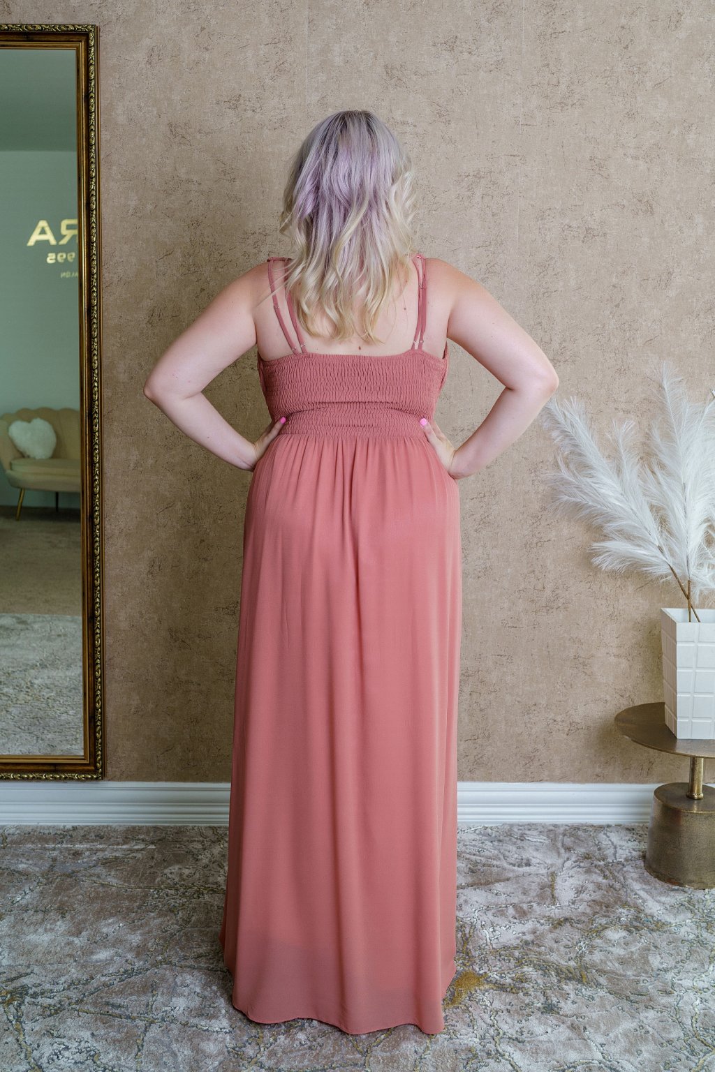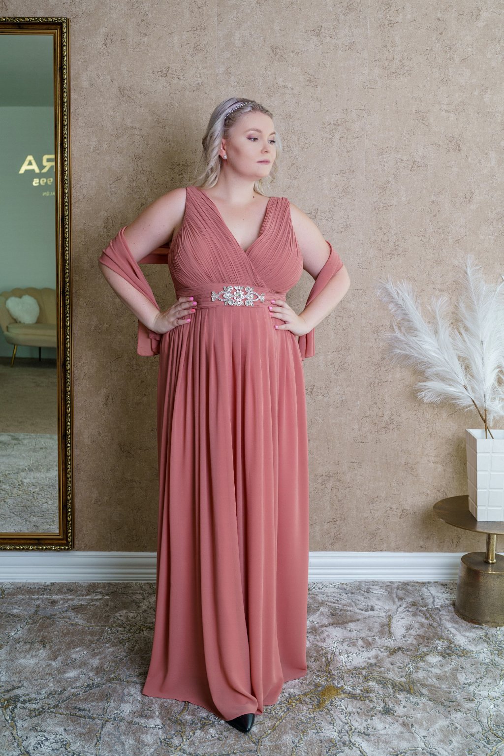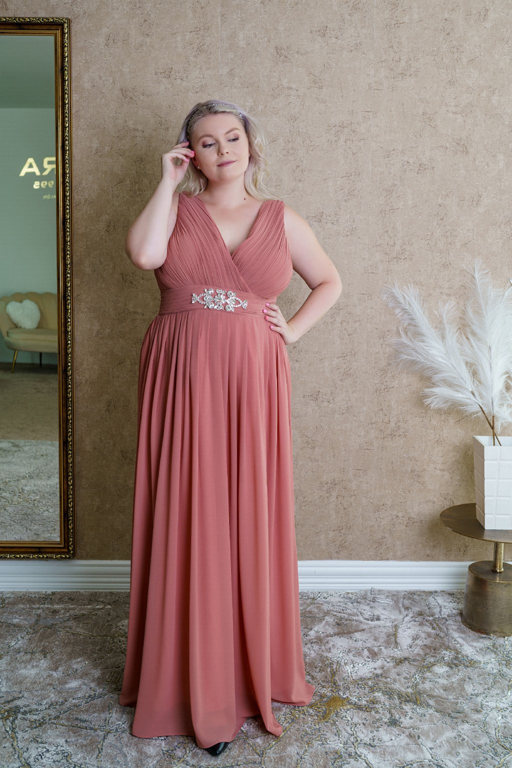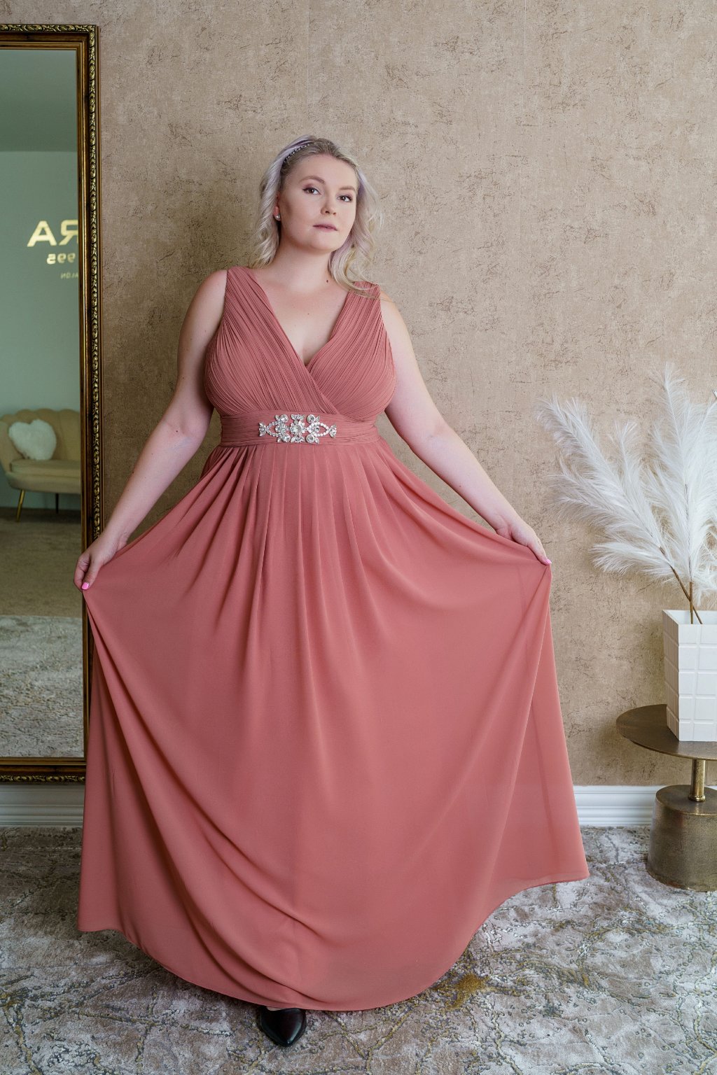 Šaty "Carolina" vďaka svojej jemnej farbe pôsobia veľmi romanticky a nežne, ideálne na slávnostné príležitosti či elegantné večerné podujatia. Ich jednoduchý strih krásne formuje siluetu aj plus-size dámy vďaka opasku obohateného o elegantný detail, pričom jemný odtieň farby dodáva šatám ženskosť a pôvab. Materiál je ľahký a padavý, čo zaručuje pohodlie počas nosenia. Celkový dizajn pôsobí luxusne, ale s dotykom minimalizmu, čo robí tieto šaty veľmi všestrannými.