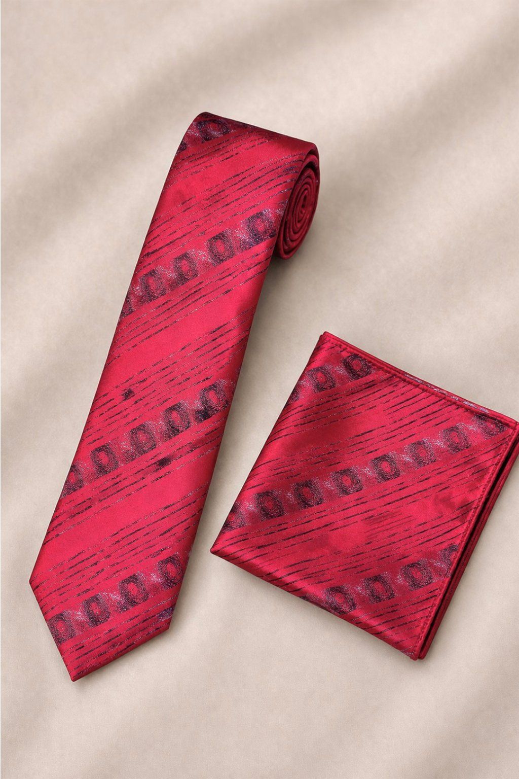 Červená hand made kravata s ornamentom a vreckovkou