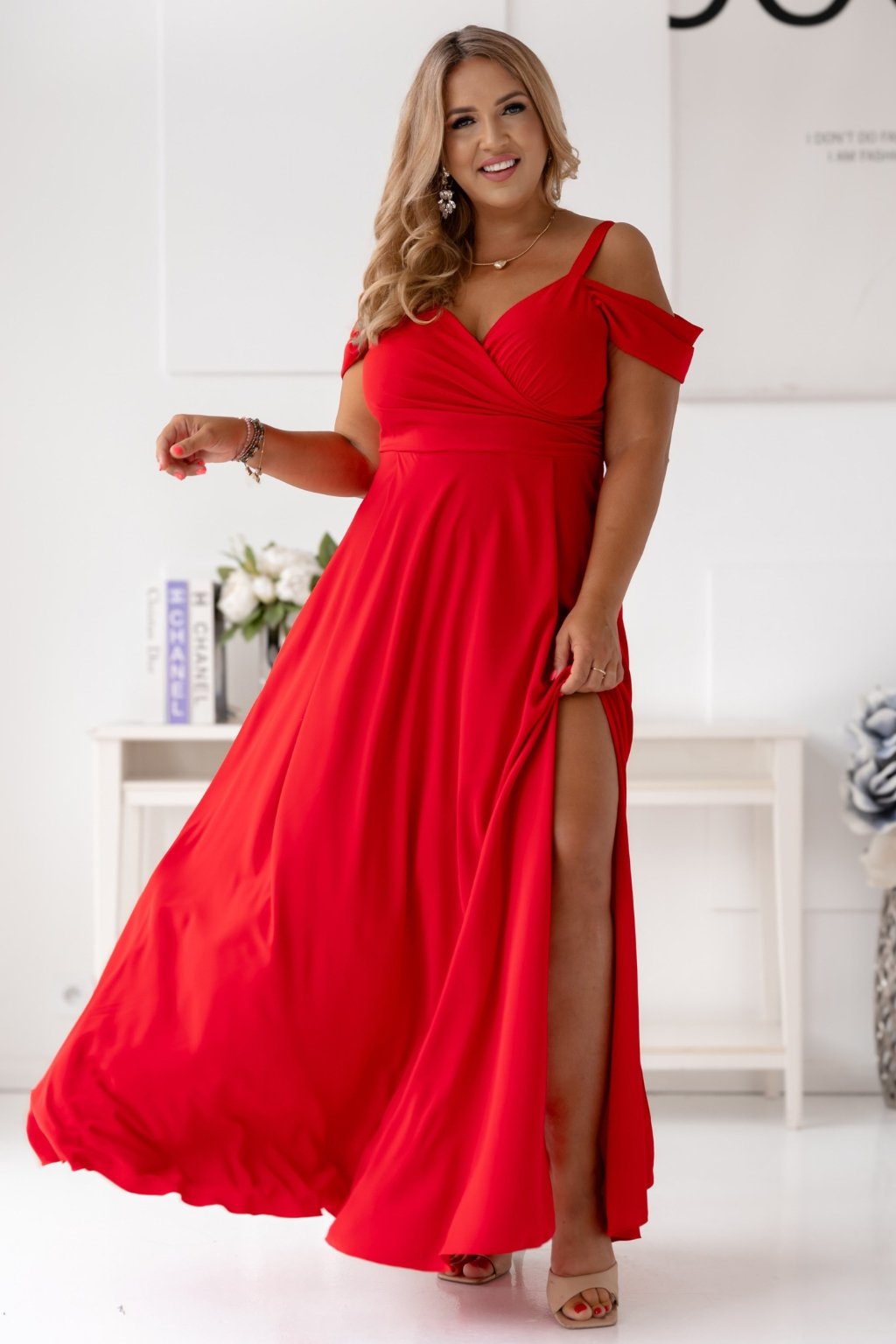 Tieto dlhé červené spoločenské šaty pre moletky sú dokonalou kombináciou elegancie a romantiky. Zavinovací vrch s jemným riasením krásne tvaruje dekolt, zatiaľ čo odhalené ramená s padavými rukávmi dodávajú šatám ženský a sofistikovaný vzhľad. Splývavá sukňa s jemným rozparkom zabezpečuje pohodlie a ladný pohyb. Ideálne na svadbu, ples, stužkovú či elegantný večierok, kde budete vyzerať neodolateľne a sebavedomo.