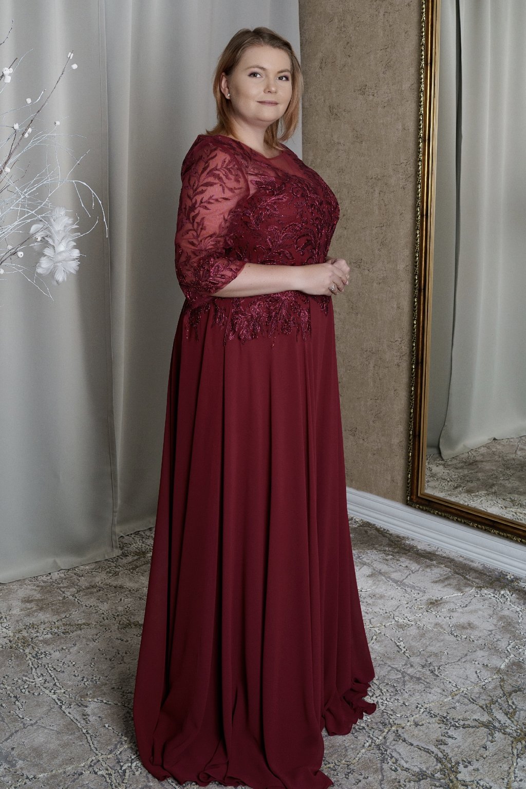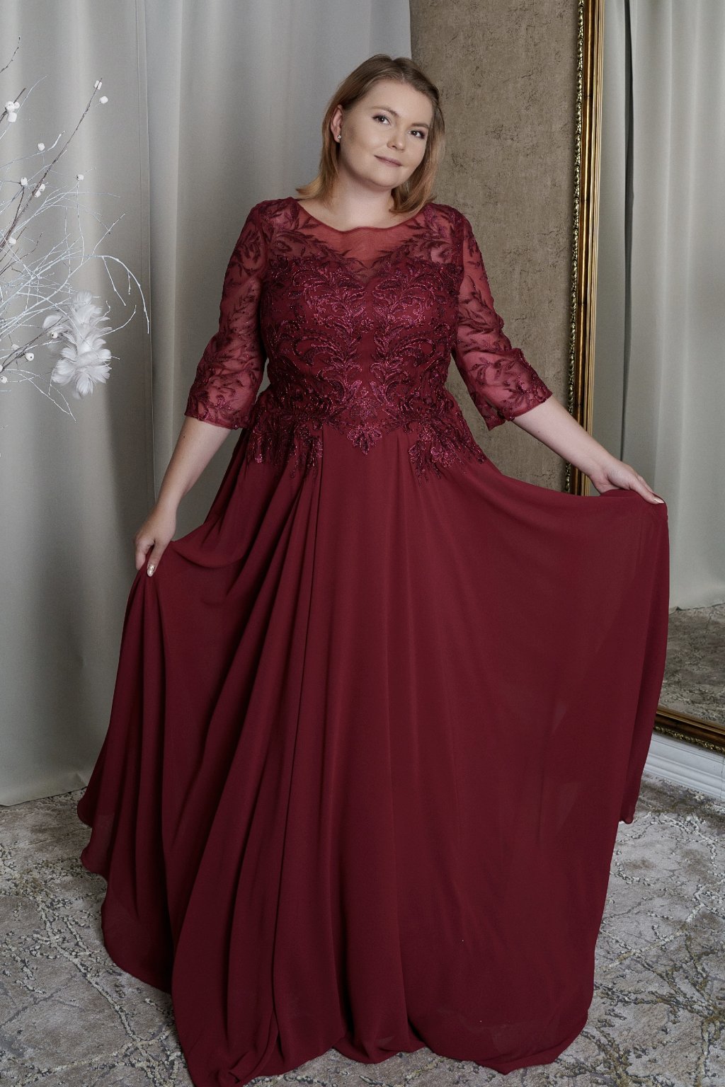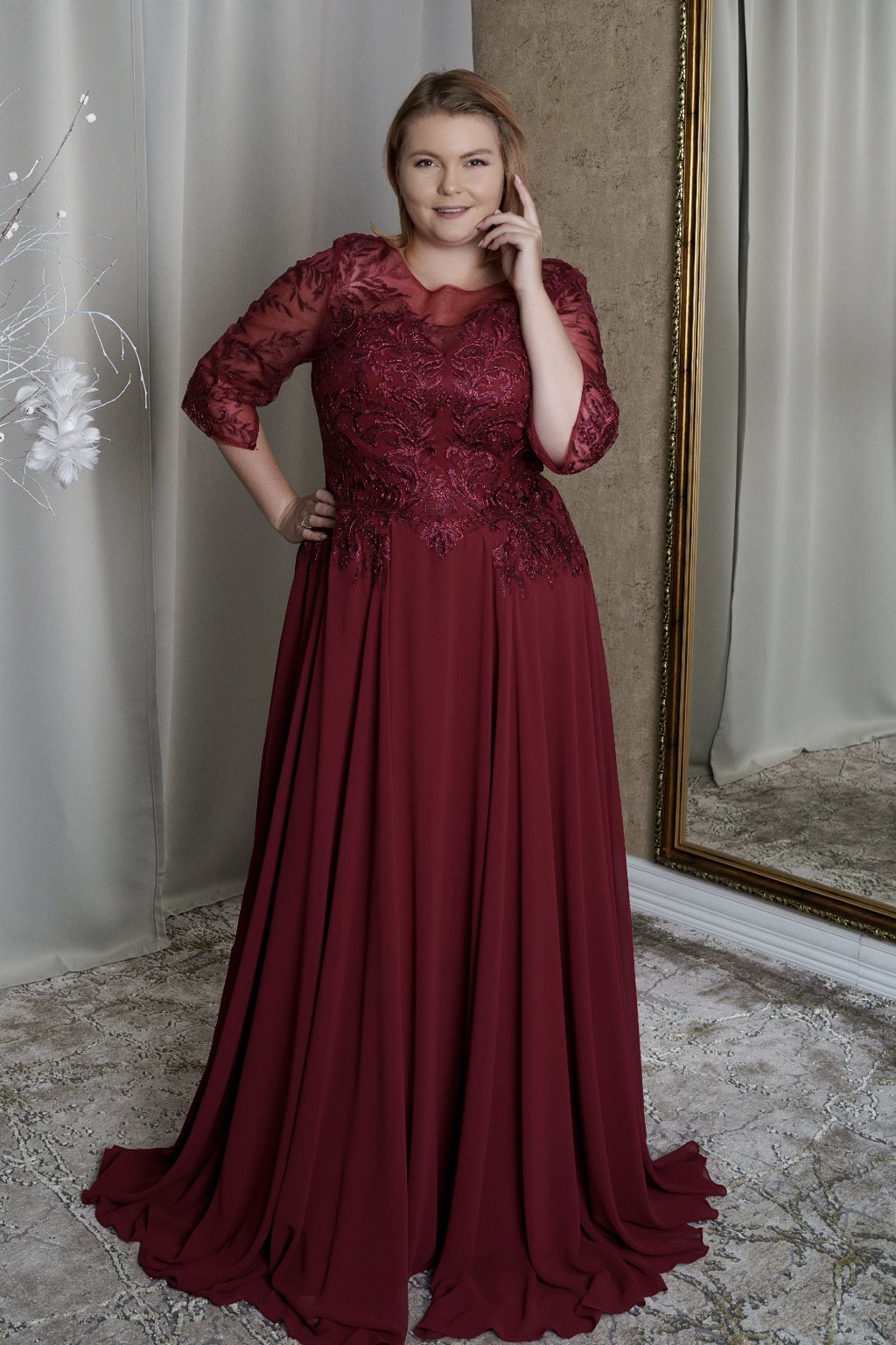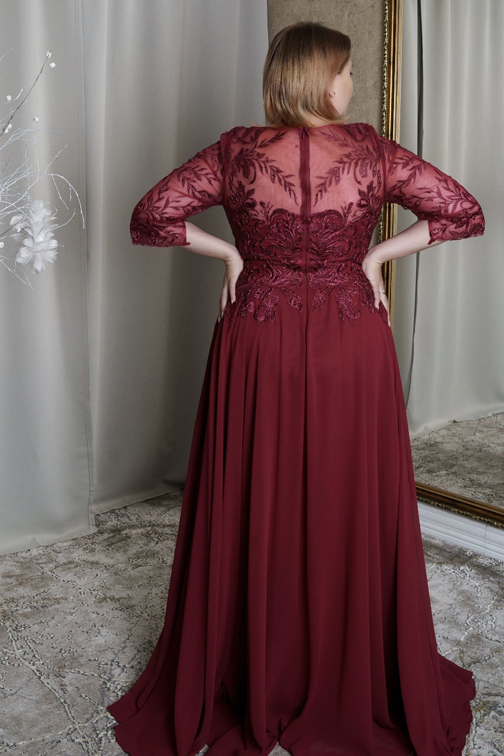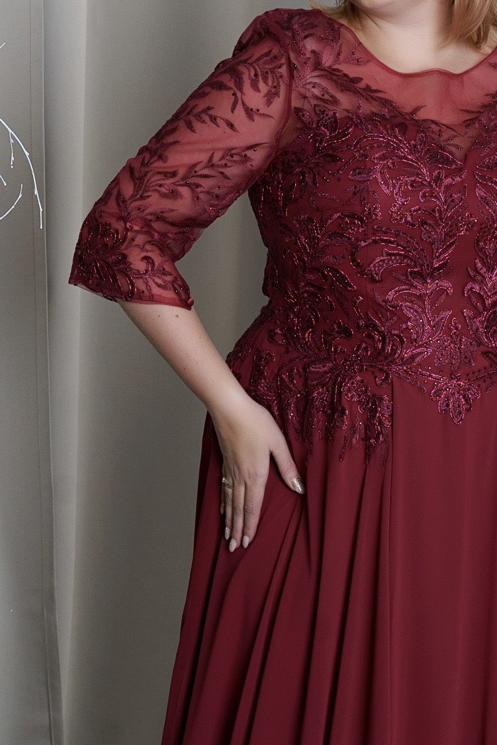 Bordové šaty s čipkovým korzetom a priehľadnými rukávmi – tieto elegantné šaty sú ideálnou voľbou na plesy, svadby či gala večery. Bohato zdobený čipkový korzet s jemnými flitrami a priehľadné rukávy dodávajú šatám romantický a sofistikovaný vzhľad. Splývavá šifónová sukňa lichotí každej postave a zaručuje pohodlie počas celého večera. Perfektné pre ženy, ktoré chcú vyzdvihnúť svoju eleganciu s nádychom noblesy.