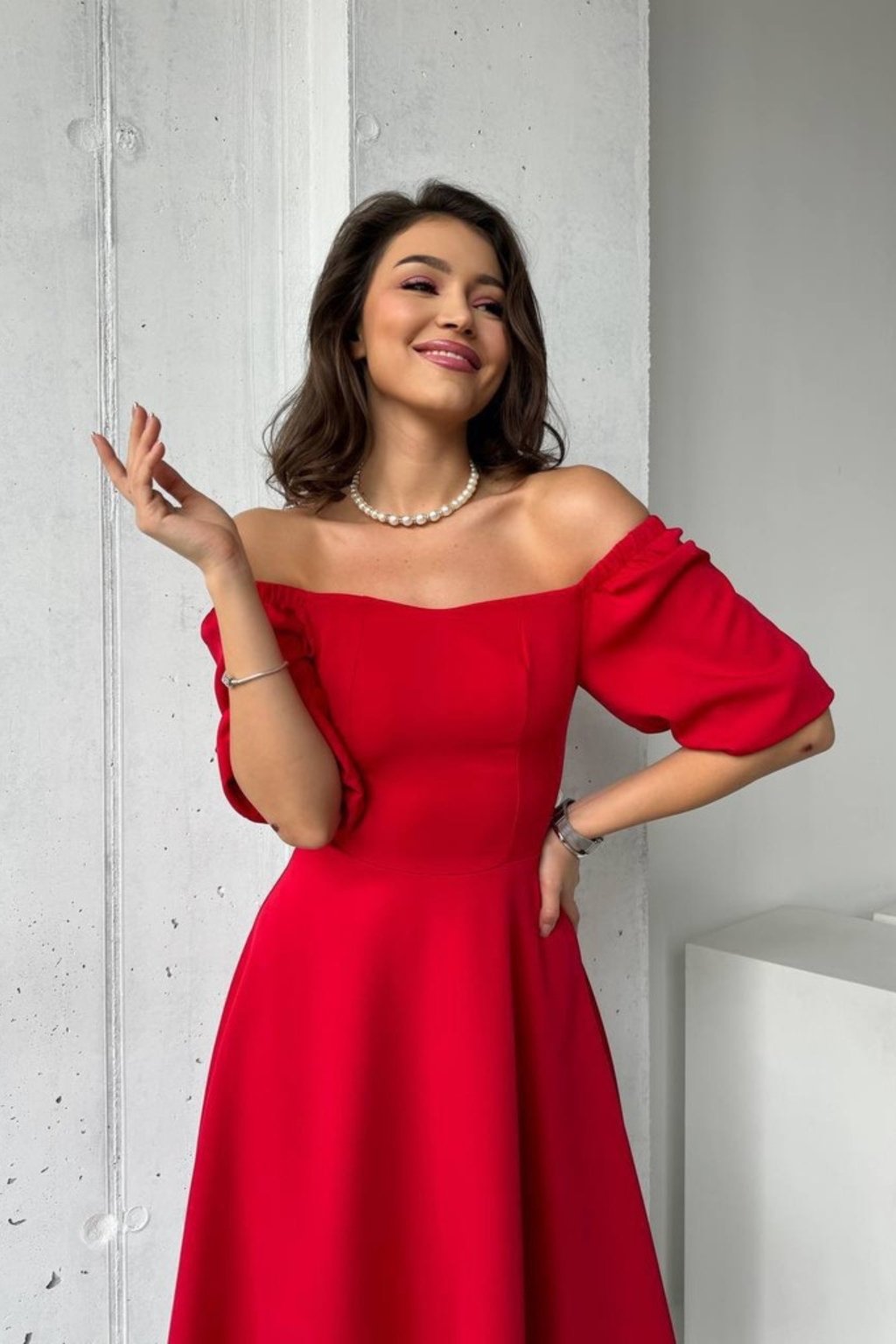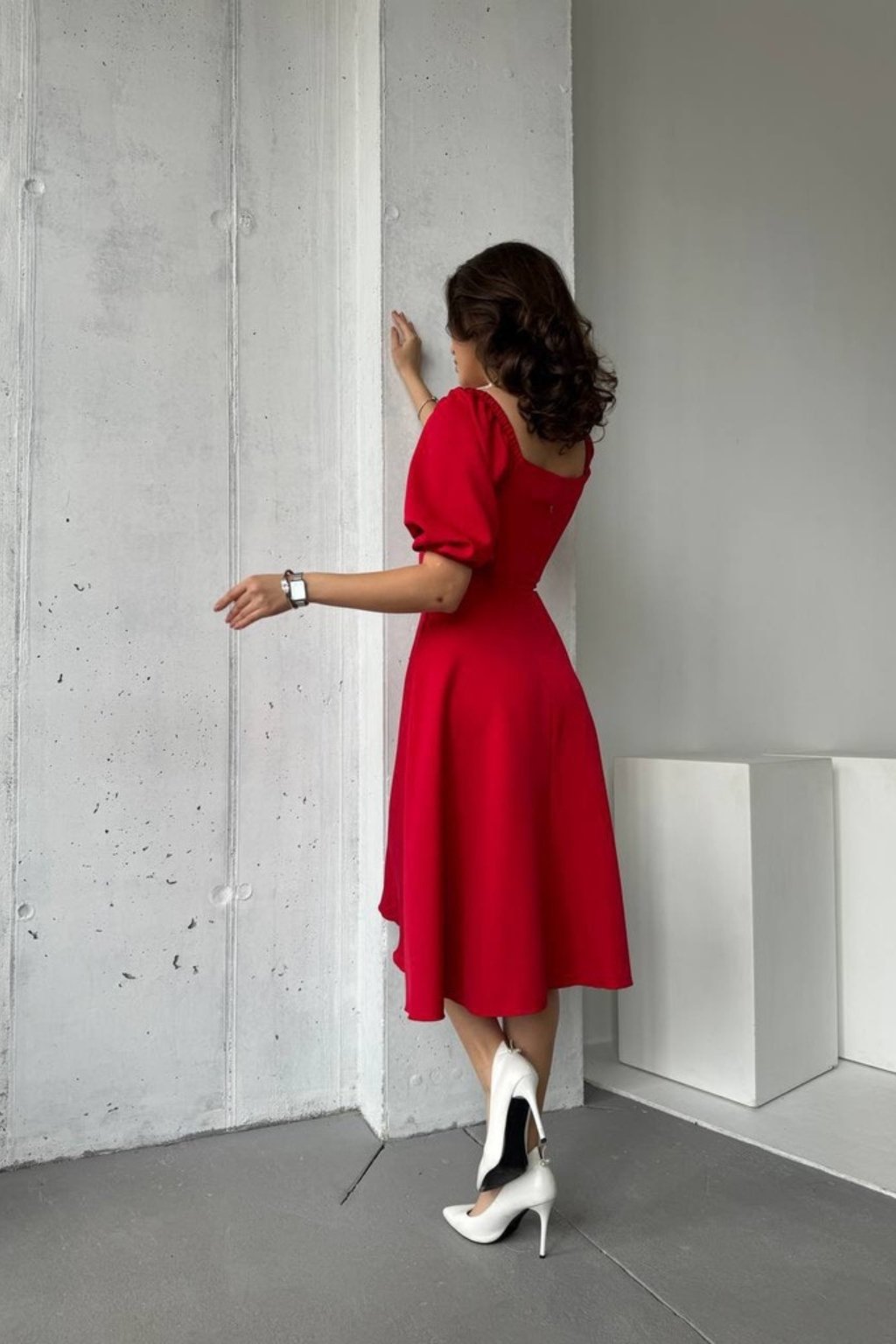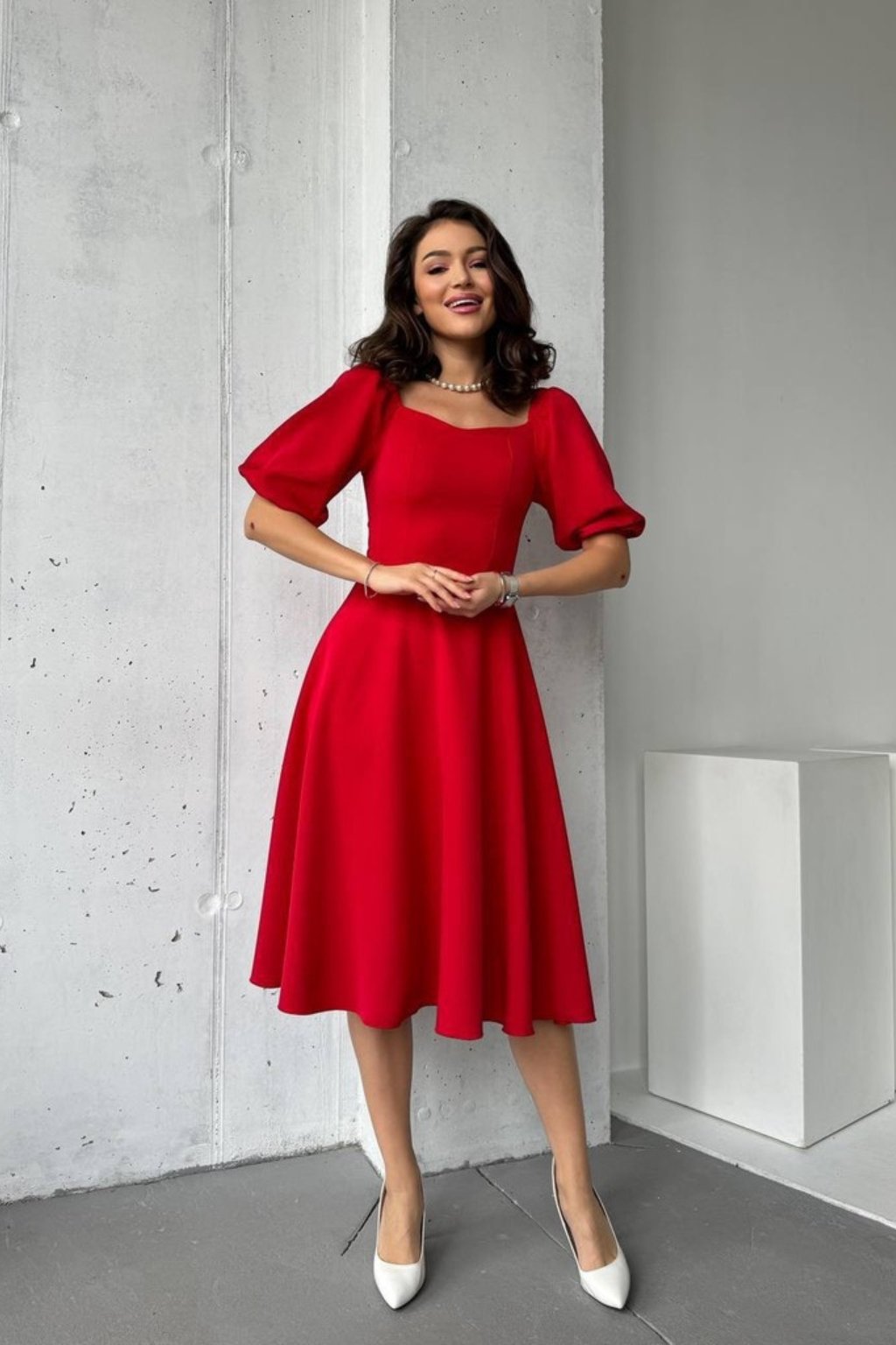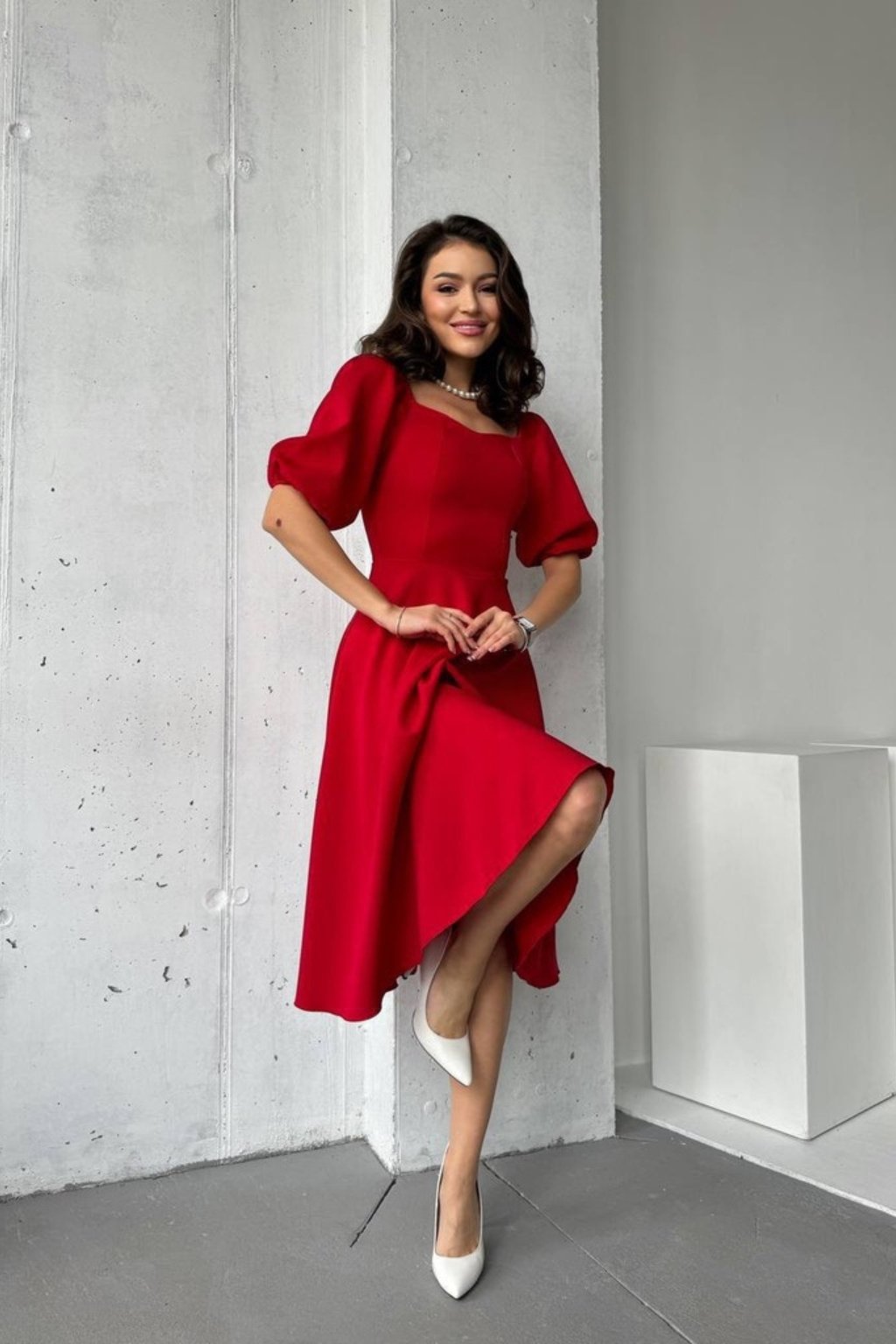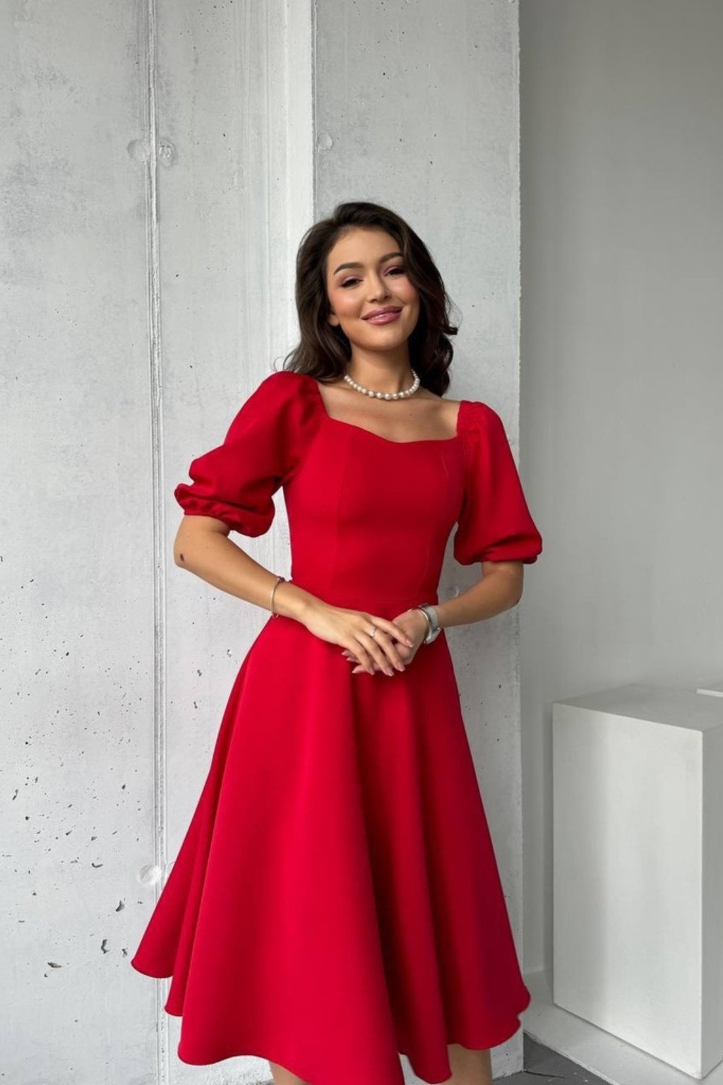 Elegantné červené midi šaty s nadčasovým strihom sú dokonalou voľbou pre oslavu, svadbu, romantickú večeru aj bežný deň, kedy chcete zažiariť. Štvorcový výstrih pôsobí žensky a sofistikovane, zatiaľ čo nafúknuté rukávy zakončené elastickou gumičkou dodávajú šatám jemný vintage nádych. Kvalitná kostýmovka zabezpečuje perfektný tvar a pohodlie počas celého dňa.