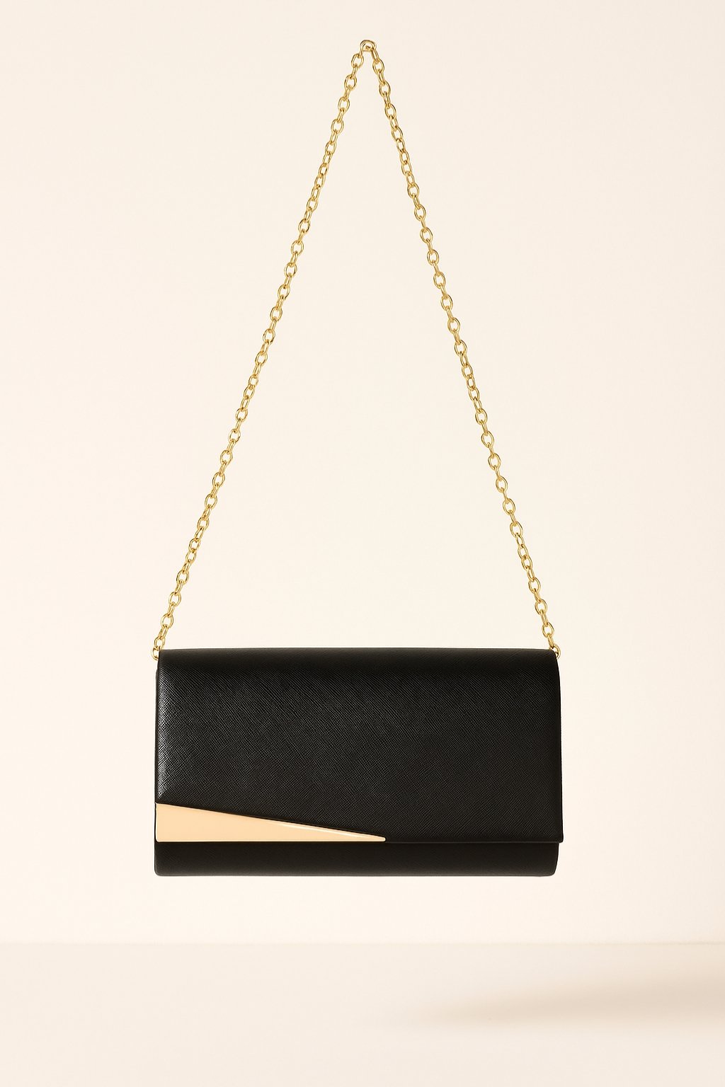 Elegantná čierna listová kabelka s jemnou štruktúrou a luxusným metalickým leskom je dokonalým doplnkom na spoločenské udalosti ako sú plesy, svadby či večierky. Jej minimalistický dizajn s kovovým detailom a praktickým zlatým retiazkovým ramienkom umožňuje nosenie v ruke aj cez plece. Vďaka svojej neutrálnej čiernej farbe ľahko doplní šaty rôznych odtieňov a dodá každému outfitu nádych elegancie a noblesy.
