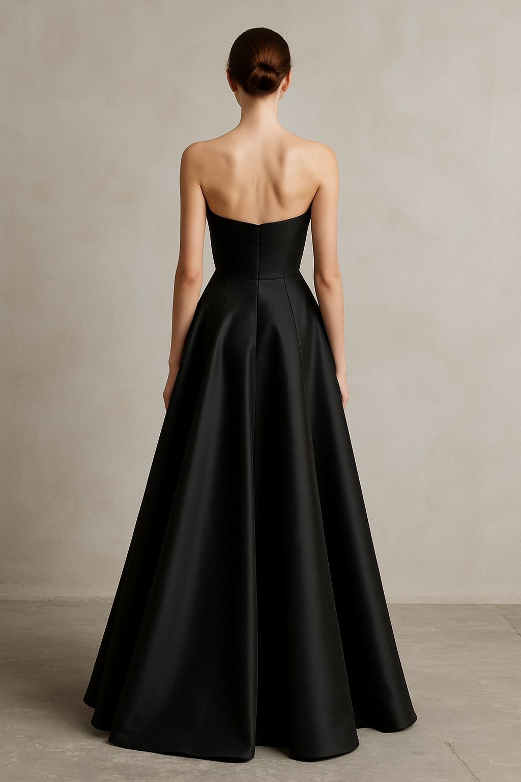Táto dlhá čierna spoločenská róba je stelesnením jemnej elegancie a ženskosti. Hladký saténový materiál, nariasený vrch, výrazný rozparok na sukni a praktické vrecká z nej robia kombináciu štýlu a komfortu. Súčasťou sú aj pripínateľné ramienka, ktoré zabezpečia väčšiu istotu a flexibilitu pri nosení – ideálna voľba na ples, stužkovú, ako popolnočné šaty či na svadbu ako hosť.