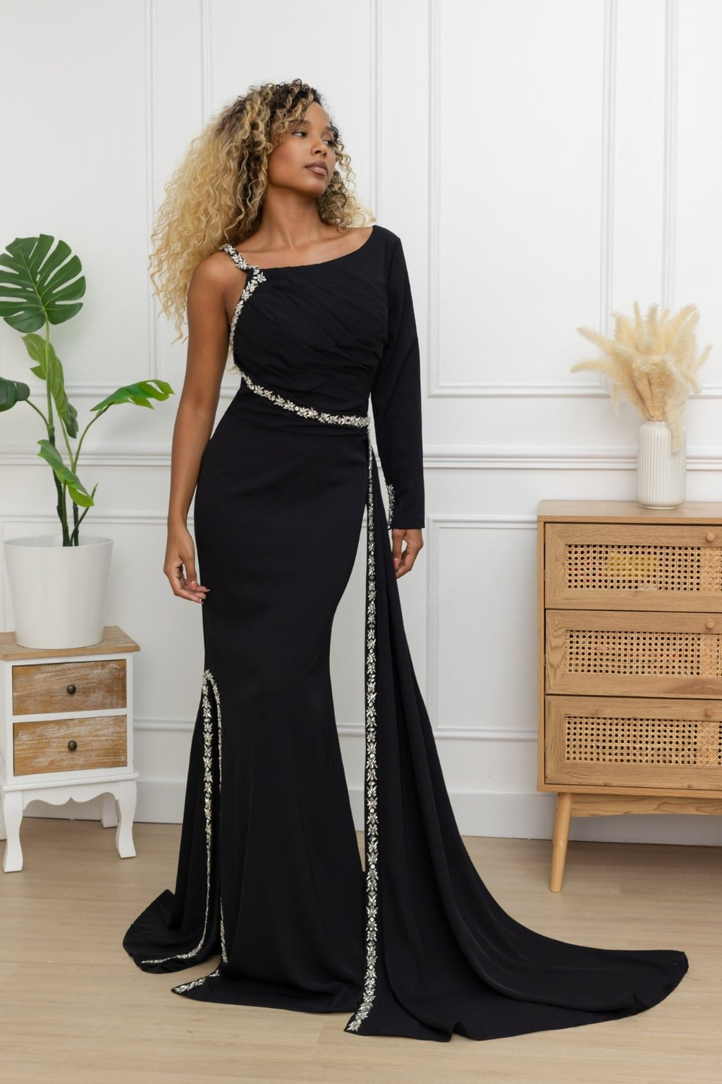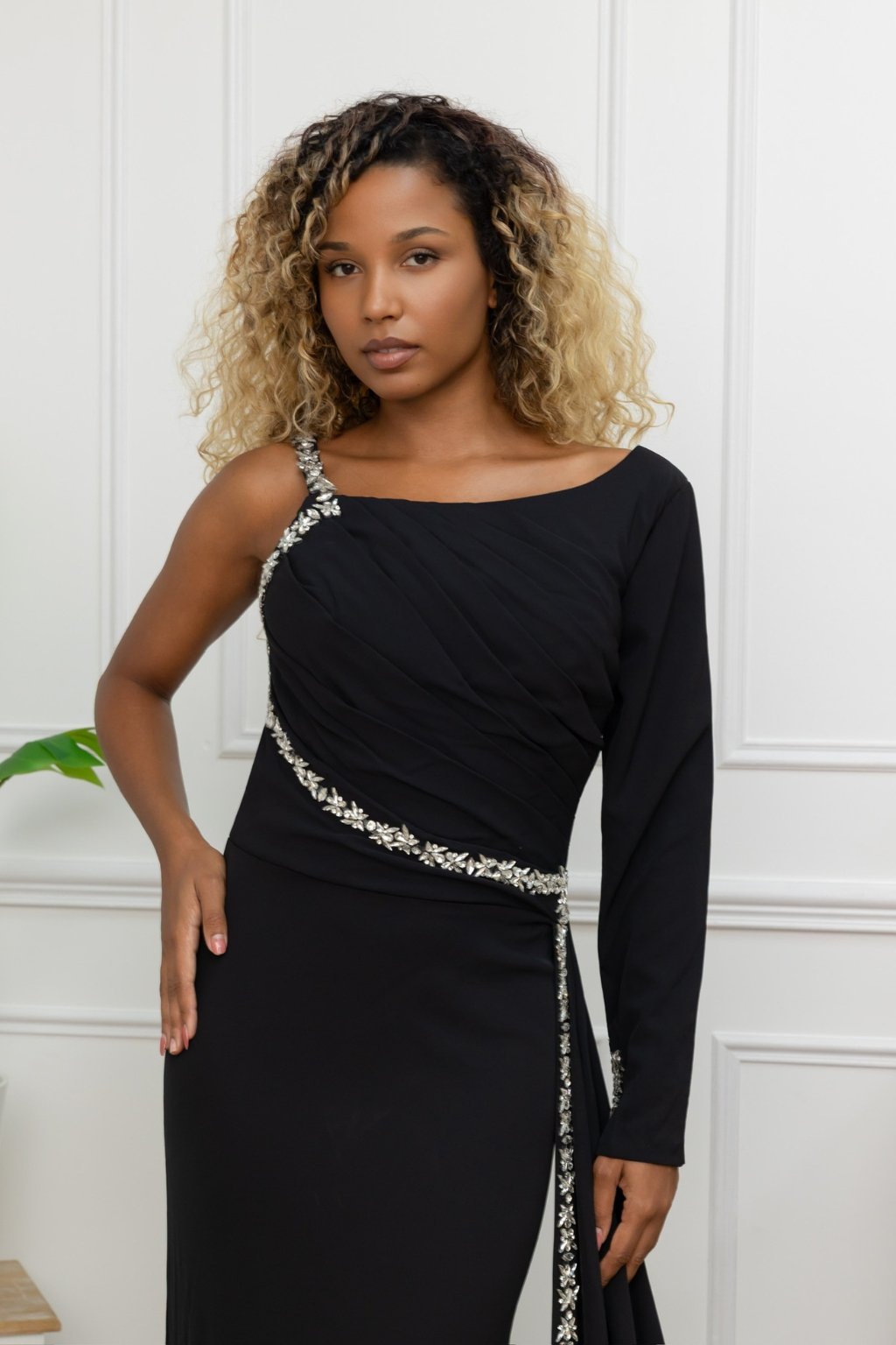 Tieto elegantné dlhé čierne spoločenské šaty s asymetrickým strihom zaujmú na prvý pohľad svojím jednoramenným vrchom a dlhým rukávom, ktorý vytvára moderný a zároveň sofistikovaný dojem. Strieborné výšivky a kamienkové detaily, ktoré lemujú rameno, pás a rozparok, dodávajú šatám luxusný charakter. Perfektná voľba na ples, galavečer, svadbu alebo formálnu udalosť, kde chcete pôsobiť výnimočne a štýlovo.