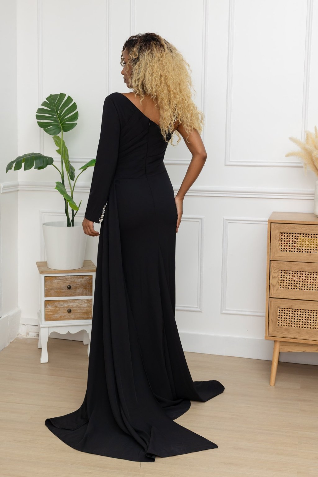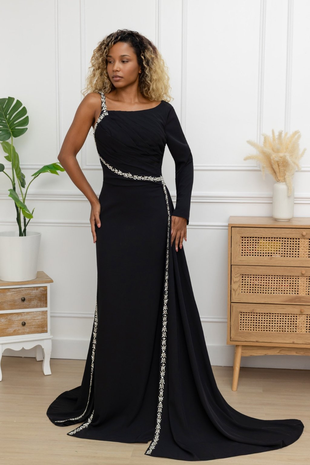 Čierne dlhé spoločenské šaty s jedným rukávom