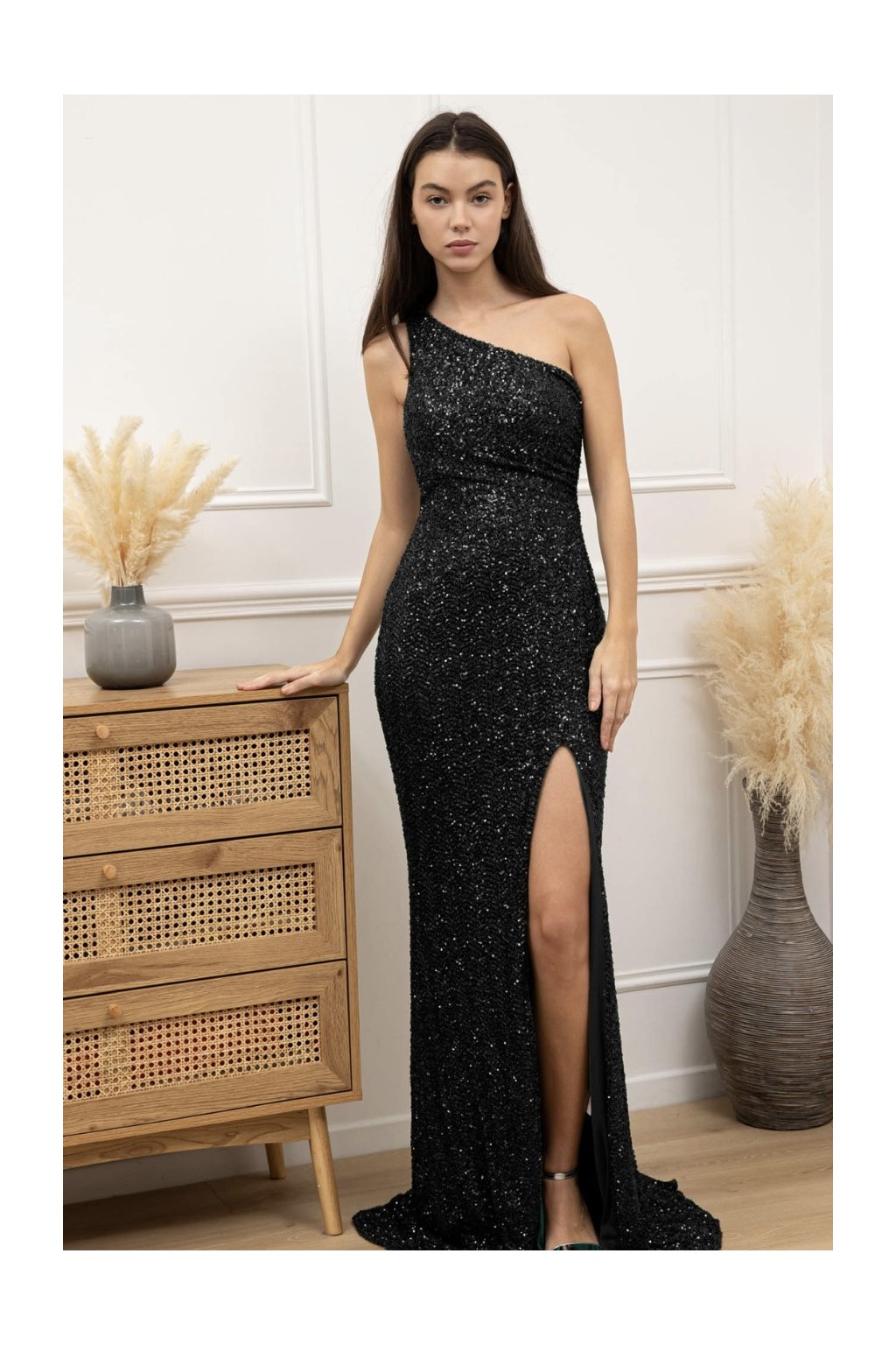 Tieto jednoramenné čierne flitrové šaty sú dokonalým spojením elegancie a moderného dizajnu. Tesne priliehajúci strih a odvážny rozparok dodávajú sofistikovaný vzhľad, zatiaľ čo prepracované viazanie na chrbte zdôrazňuje ženskosť. Ideálne na slávnostné príležitosti, ako sú plesy, gala večere alebo romantické večierky.