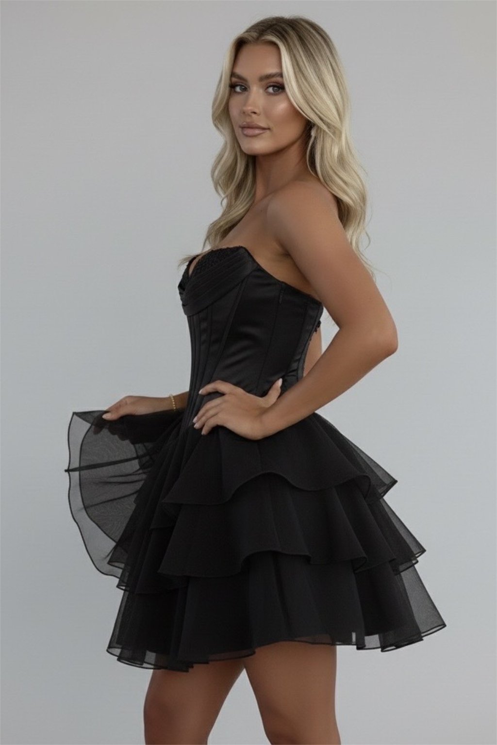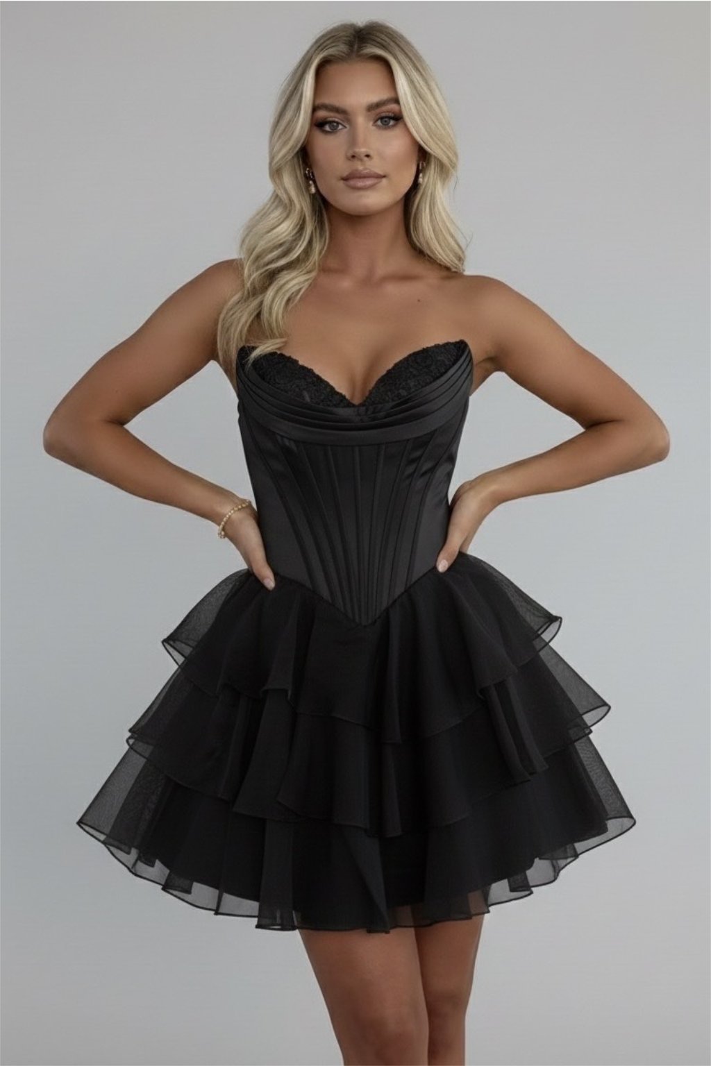 Elegantné krátke spoločenské šaty v čiernej farbe očaria na prvý pohľad svojím romantickým vrstveným šifónovým volánovým spodkom a výrazným korzetovým vrchom bez ramienok s čipkovou aplikáciou. Vďaka špeciálnemu strihu krásne sadnú na širší hrudník, zatiaľ čo zapínanie na zips vzadu zaručí pohodlie. Ideálne na ples, stužkovú, oslavu, svadbu či večierok.