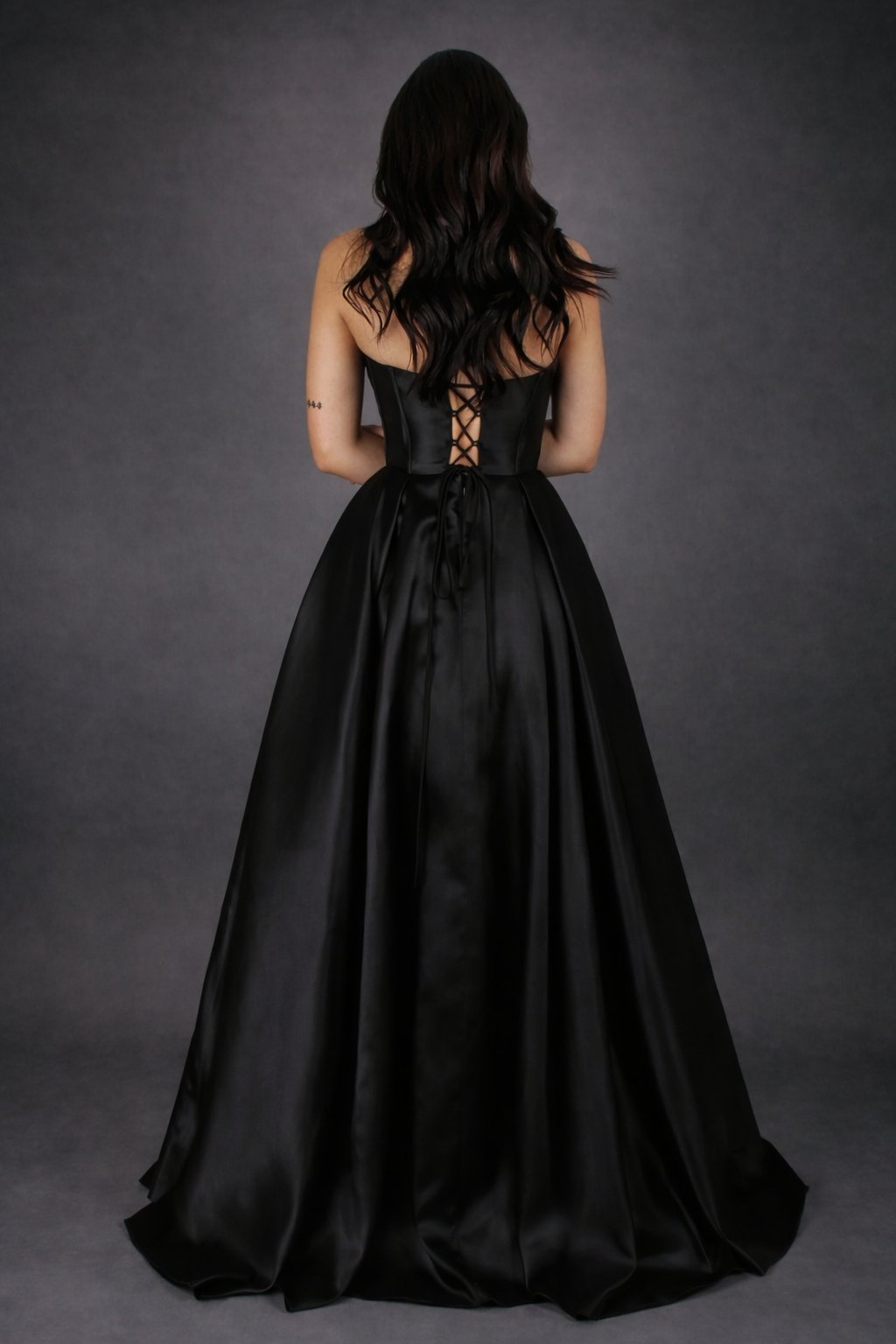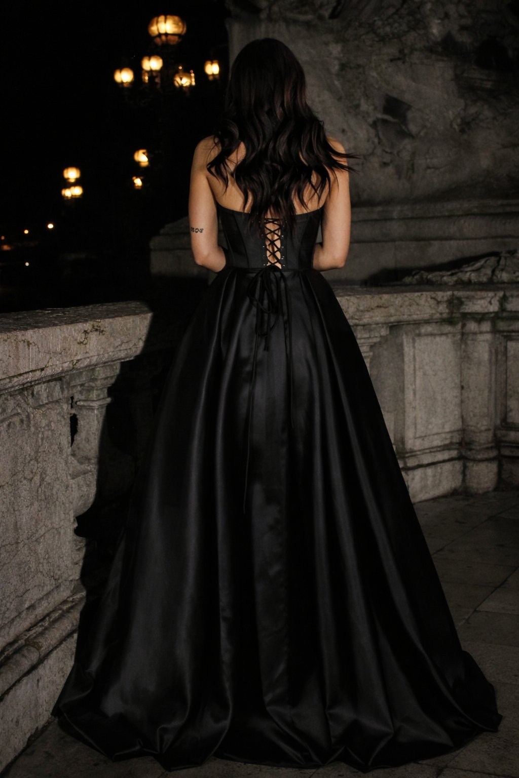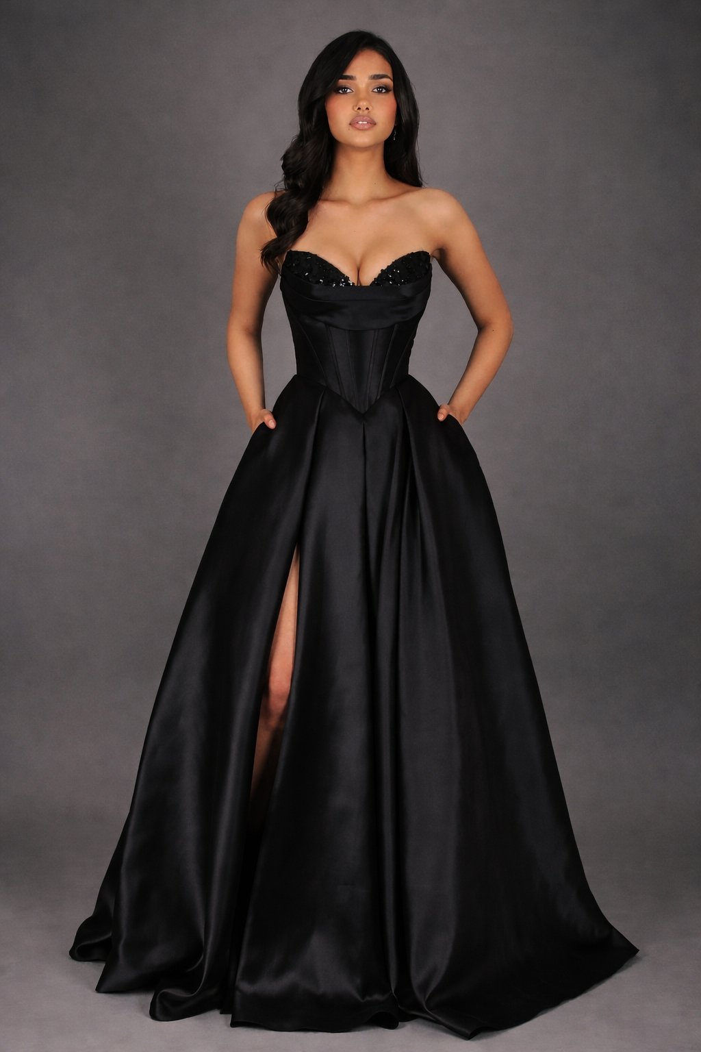 Zvodné dlhé čierne spoločenské šaty bez ramienok s korzetovým vrchom a trblietavými detailmi sú stelesnením ženskosti a elegancie. Rozšírená saténová sukňa s vysokým rozparkom dodáva šatám glamour vzhľad. Ideálne na ples, stužkovú, galavečer, červený koberec či valentínsku večeru.