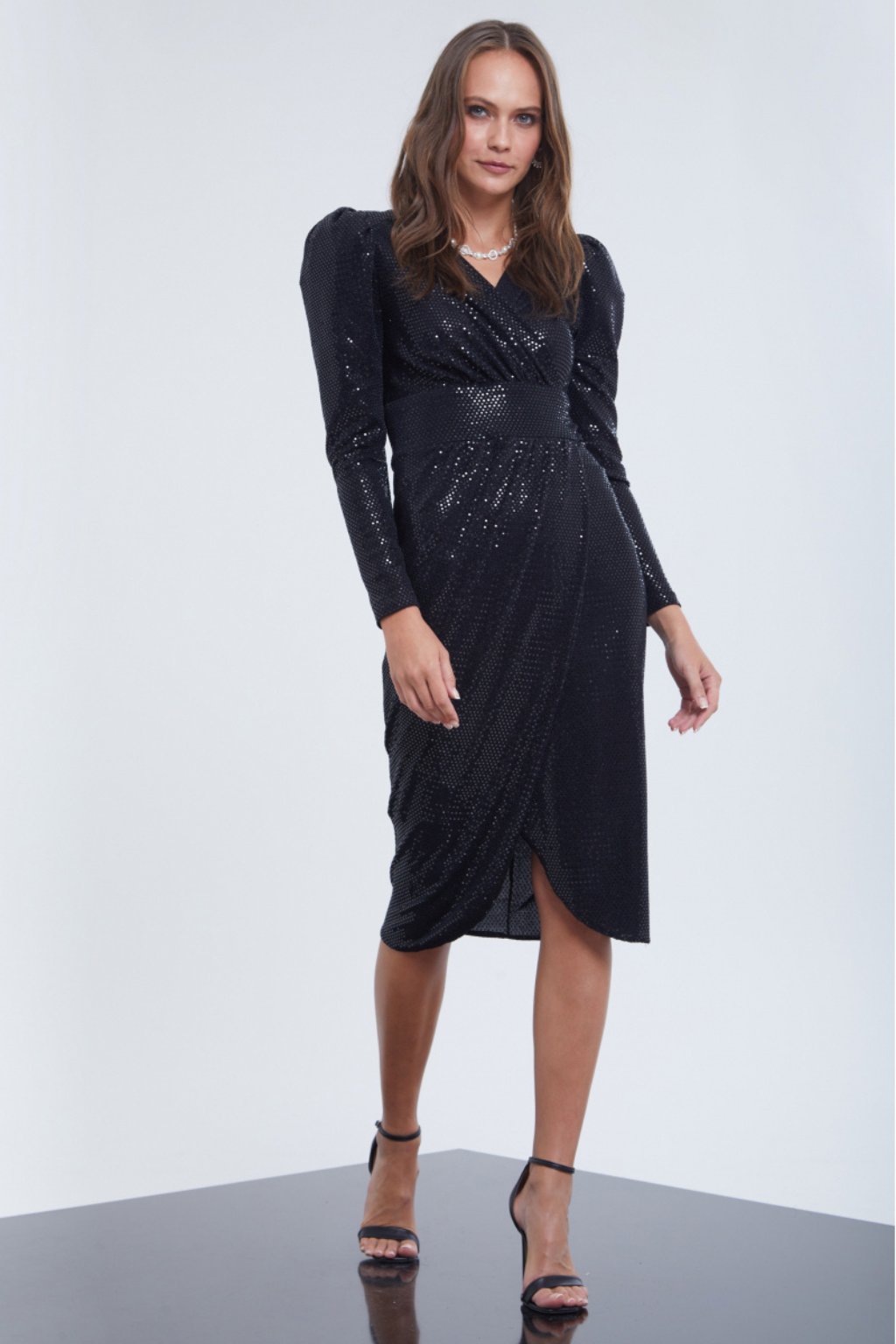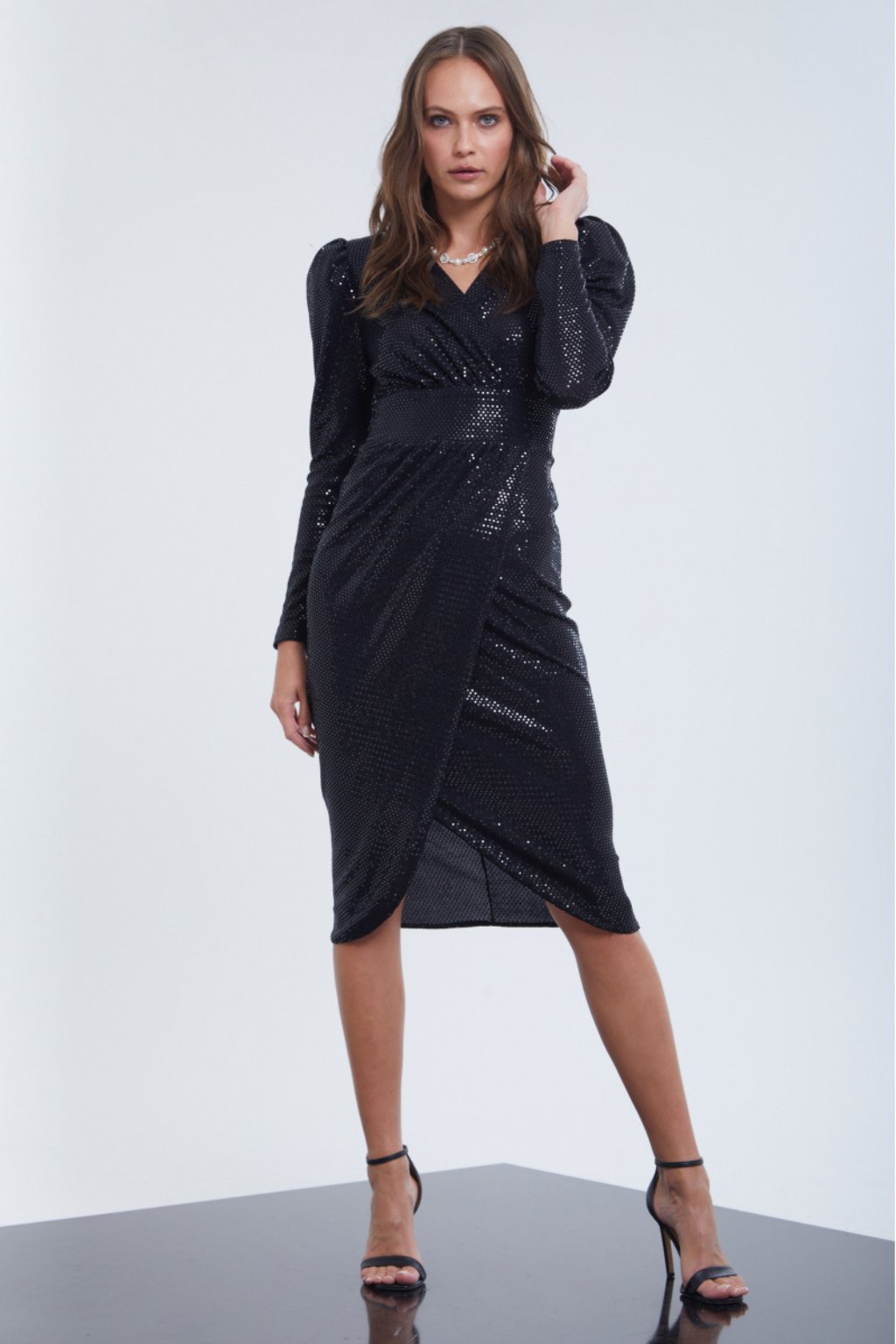Čierne midi šaty s flitrami a zavinovacím dizajnom pre dokonalý glamour vzhľad. Jemné riasenie zvýrazňuje pás, zatiaľ čo dlhé rukávy a priliehavý strih dodávajú šatám eleganciu. Ideálne na večierky, oslavy alebo silvestrovskú noc, kde sa chcete cítiť výnimočne a žiariť. Flitrovaný materiál pridáva šatám šmrnc a luxusný nádych.