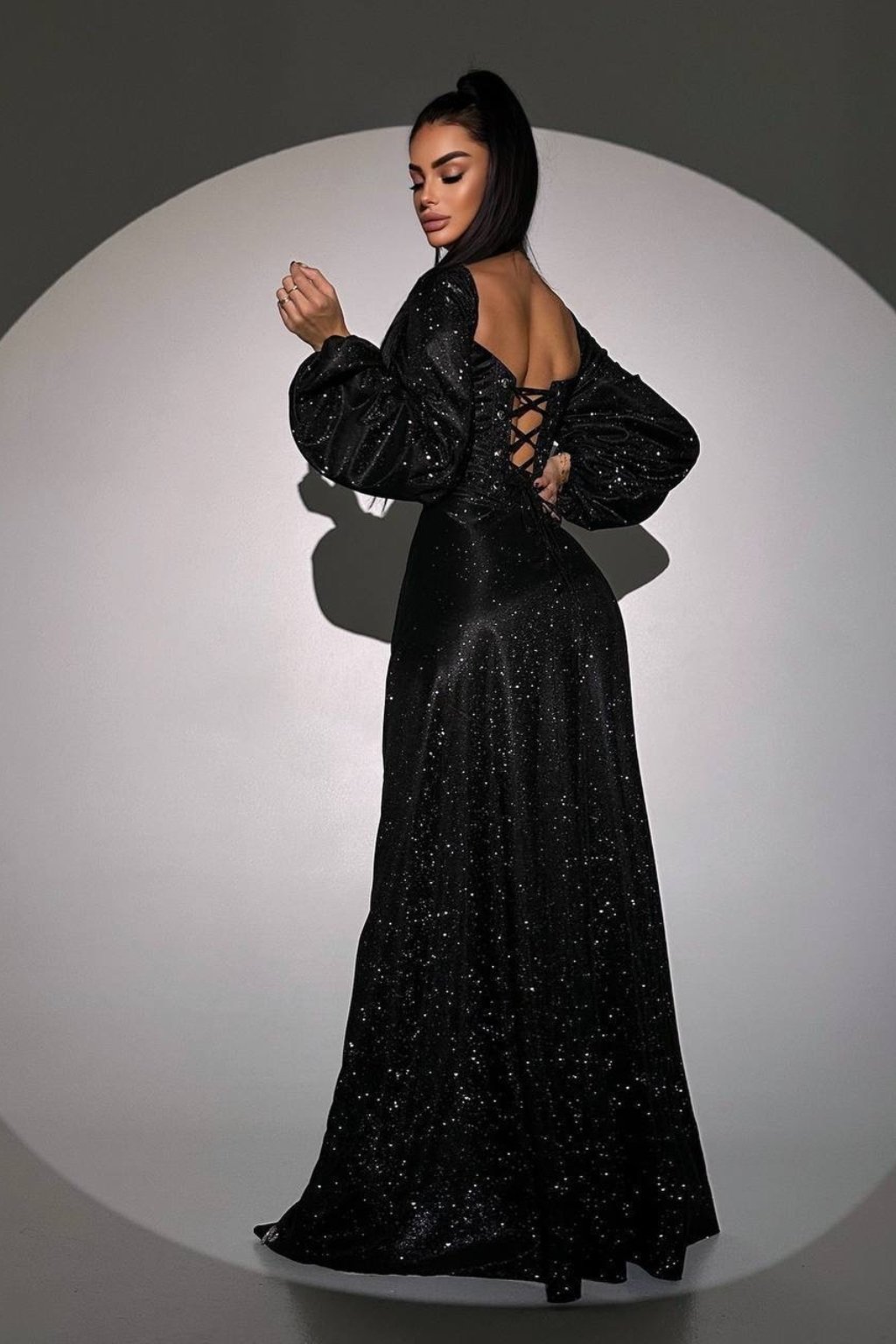 Zaujmite pohľady v tomto luxusnom čiernom trblietavom sete, ktorý tvorí korzetový vrch s hranatým výstrihom a dlhá maxi sukňa s vysokým rázporkom. Dlhé balónové rukávy dodávajú šatám dramatickosť, zatiaľ čo viazanie na chrbte zabezpečuje dokonalé prispôsobenie postave. Veľkou výhodou je, že vrch aj sukňu môžete nosiť aj samostatne, čím si vytvoríte viac outfitov na rôzne príležitosti. Tento elegantný komplet je ideálnou voľbou na ples, stužkovú, večierok alebo silvestrovskú párty, kde zaručene zažiarite.