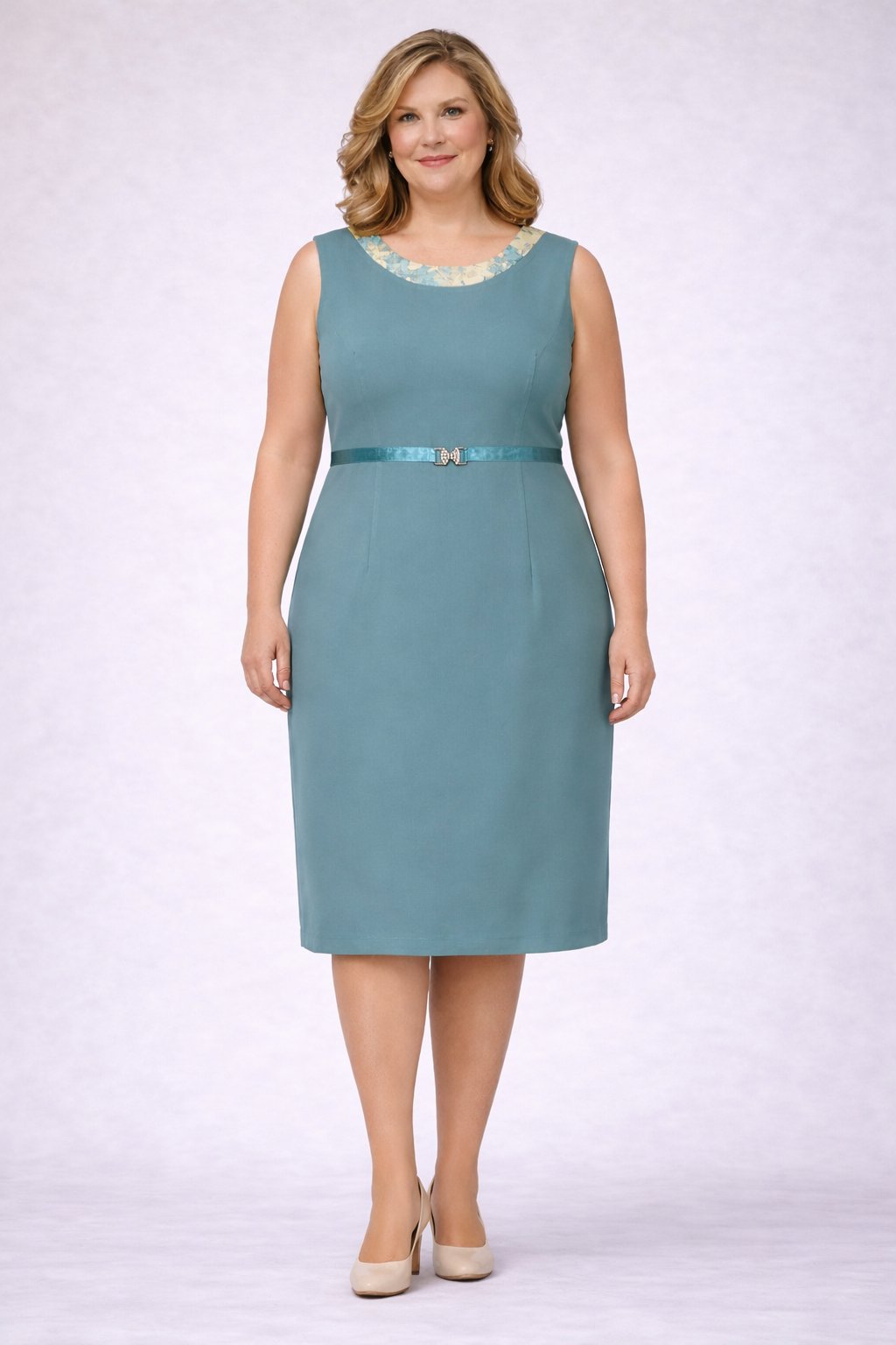 Šaty majú okrúhly výstrih, jemne priliehavý strih a dekoratívny opasok so sponou v páse, ktorý zvýrazní siluetu. Dlhé sako s kvetinovým vzorom v krémovo-tyrkysovej kombinácii pôsobí luxusne a slávnostne. Tento plus size kostým pre moletky je vhodný ako šaty pre svadobnú mamu, na jubileum, krst či rodinnú oslavu.