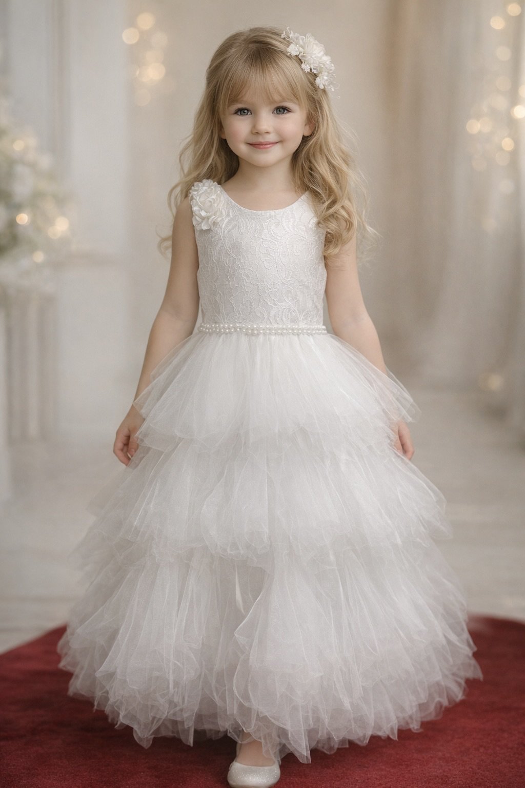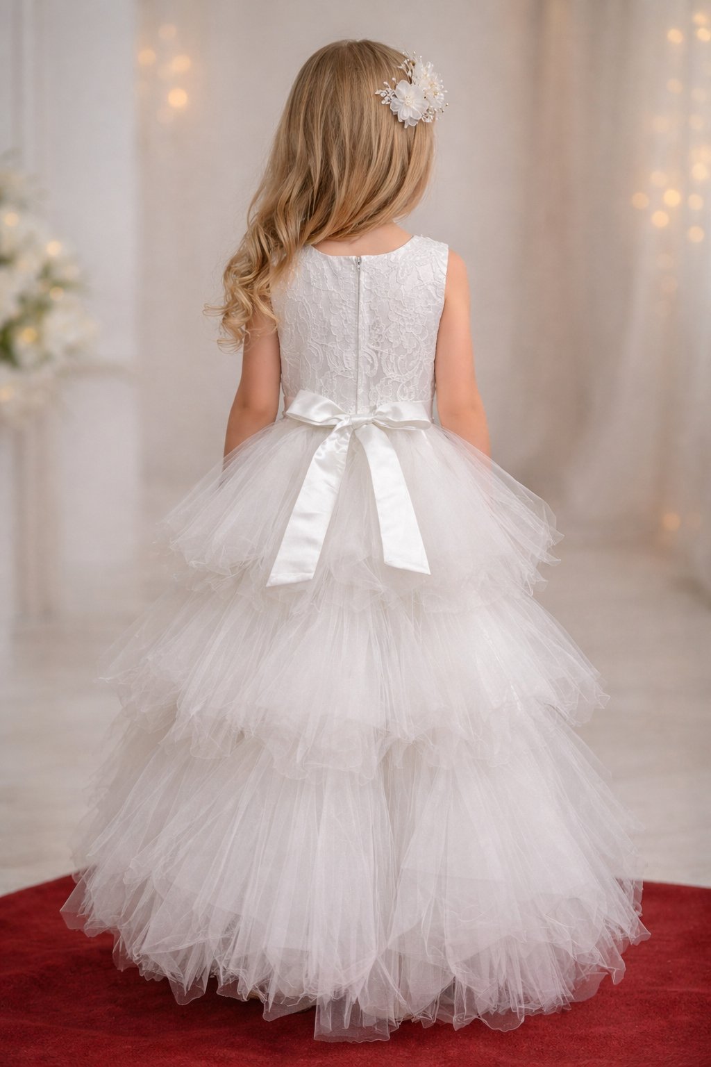 Luxusné biele dievčenské spoločenské šaty v princeznovskom štýle sú dokonalou voľbou na svadbu, prvé sväté prijímanie, oslavu, rodinné fotenie či slávnostný program v škôlke, či v škole. Model má dlhú nadýchanú tylovú sukňu vo viacerých vrstvách, elegantný čipkovaný vrch bez rukávov a jemný okrúhly výstrih. Pás zvýrazňuje perličkový detail, zadná časť je doplnená o saténovú mašľu, ktorá dodáva šatám romantický nádych.