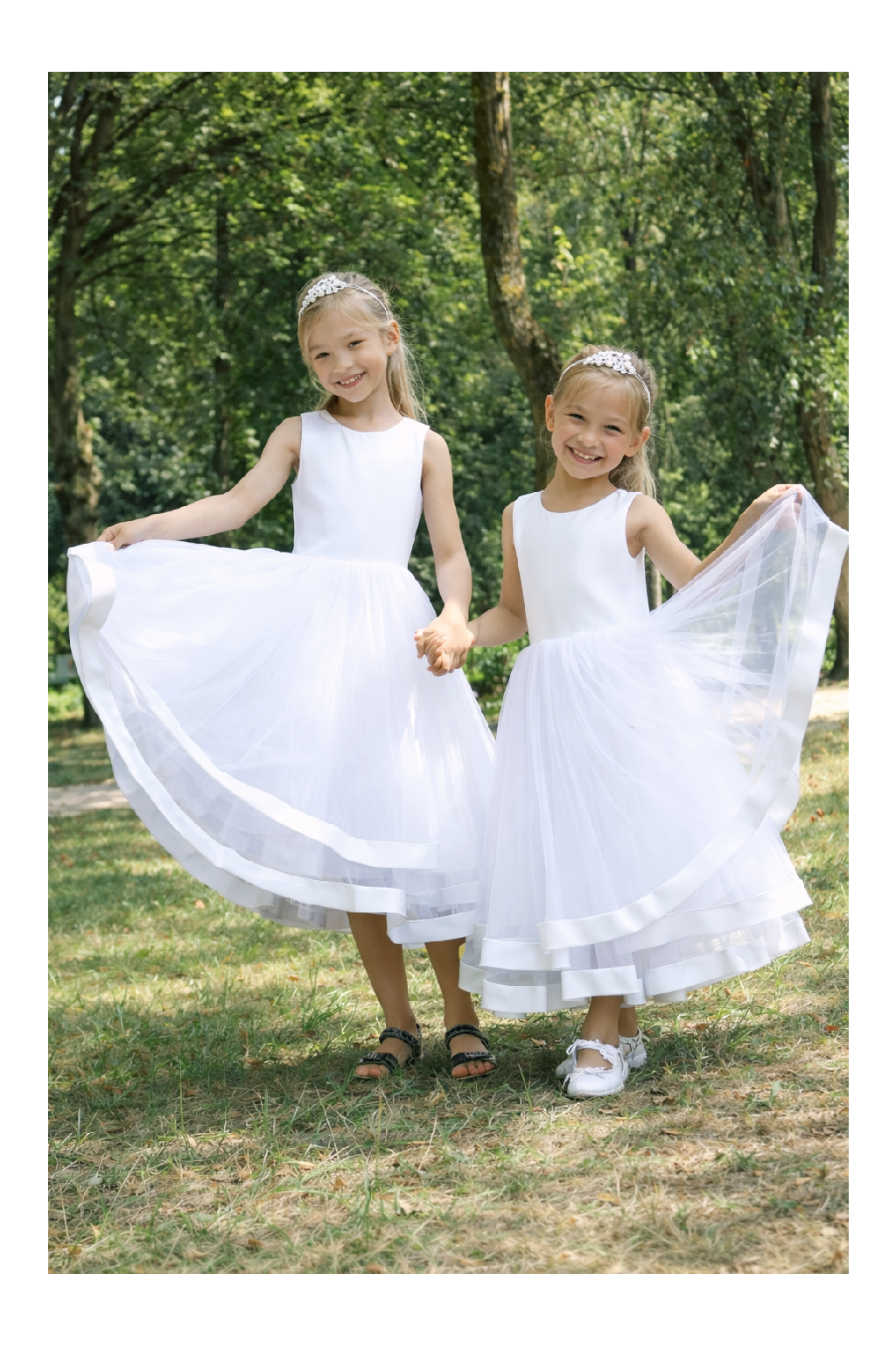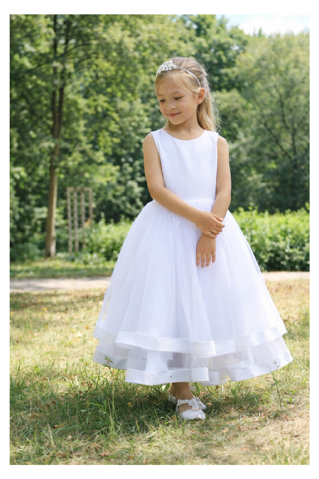 Elegantné biele dievčenské spoločenské šaty po kolená sú ideálnou voľbou na svadbu, prvé sväté prijímanie, oslavu, rodinné fotenie či slávnostné vystúpenie. Áčková tylová sukňa s pevnými saténovými lemami dodáva šatám objem a dokonalý tvar.
