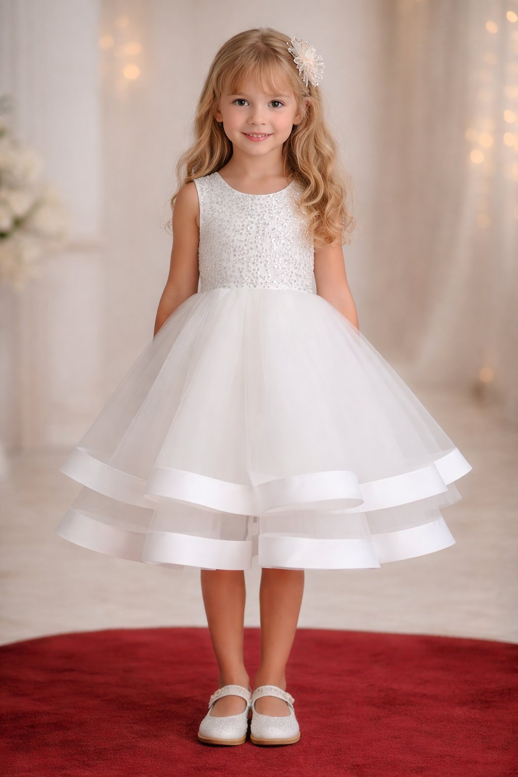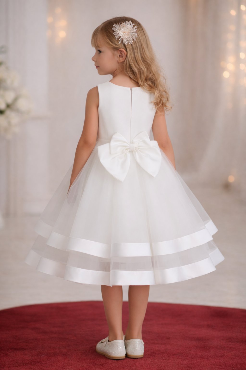 Elegantné biele dievčenské spoločenské šaty po kolená sú ideálnou voľbou na svadbu, prvé sväté prijímanie, oslavu, rodinné fotenie či slávnostné vystúpenie. Model má bohato zdobený vrch s jemnými kamienkami, ktorý krásne odráža svetlo a pôsobí luxusne. Áčková tylová sukňa s pevnými saténovými lemami dodáva šatám objem a dokonalý tvar. Zadnú časť dopĺňa výrazná saténová mašľa, ktorá zvýrazňuje pás a dodáva romantický nádych.