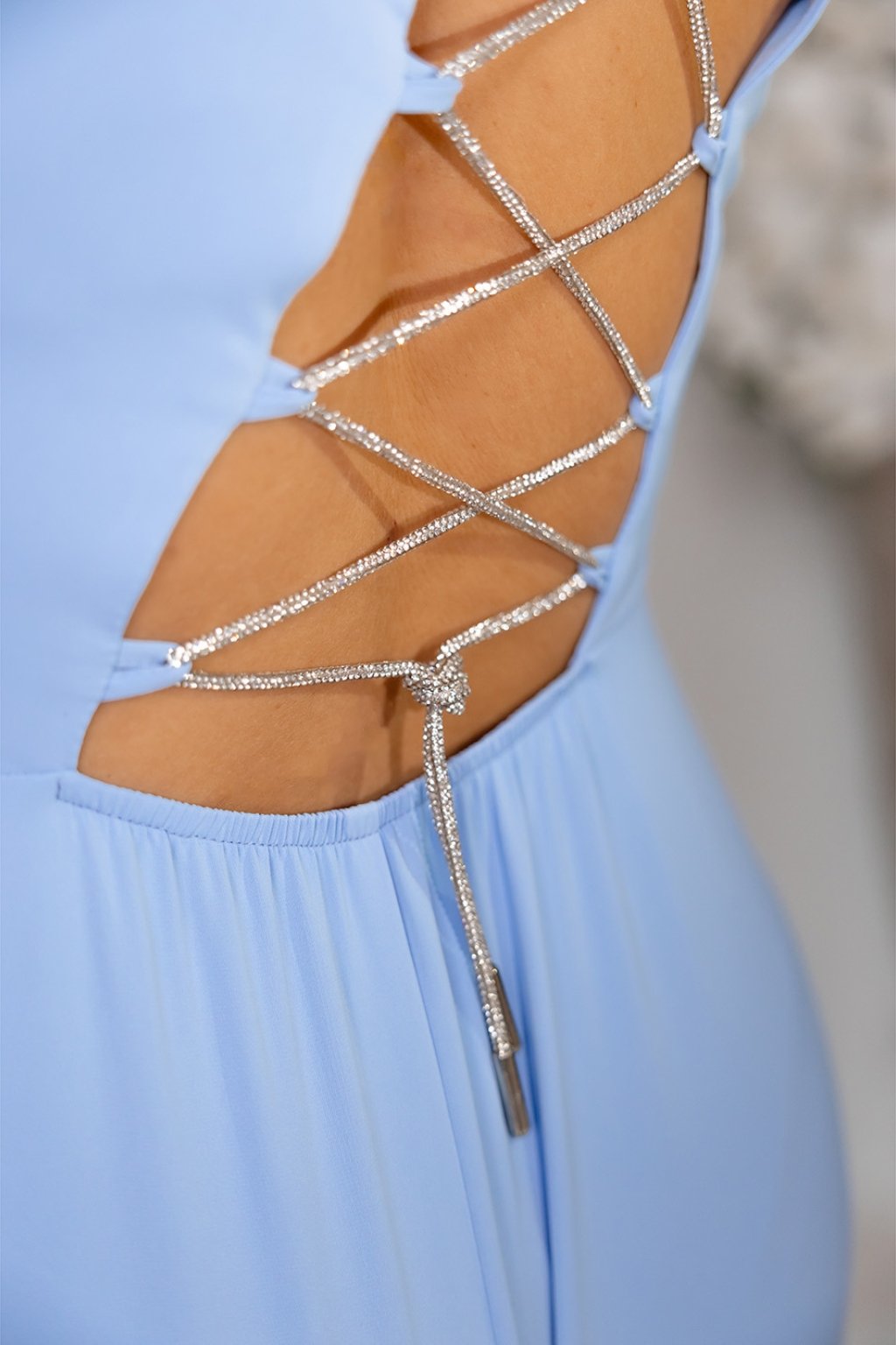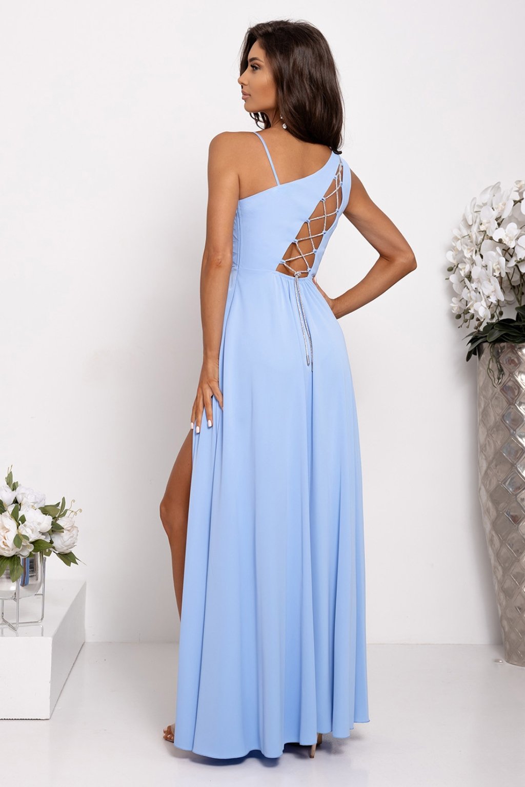 Tieto dlhé bledomodré spoločenské šaty s asymetrickým vrchom a jedným ramienkom očaria svojou eleganciou a moderným dizajnom. Šaty sú na viazanie, v oblasti pása majú praktickú gumičku pre dokonalé prispôsobenie postave a súčasťou balenia je aj jednoduchá šnurovačka, ktorú si viete vymeniť podľa príležitosti. Vysoký rozparok na nohe, jemne rozšírená sukňa a trblietavé detaily na chrbte robia z týchto šiat ideálnu voľbu na ples, stužkovú, svadbu, oslavu či večierok.