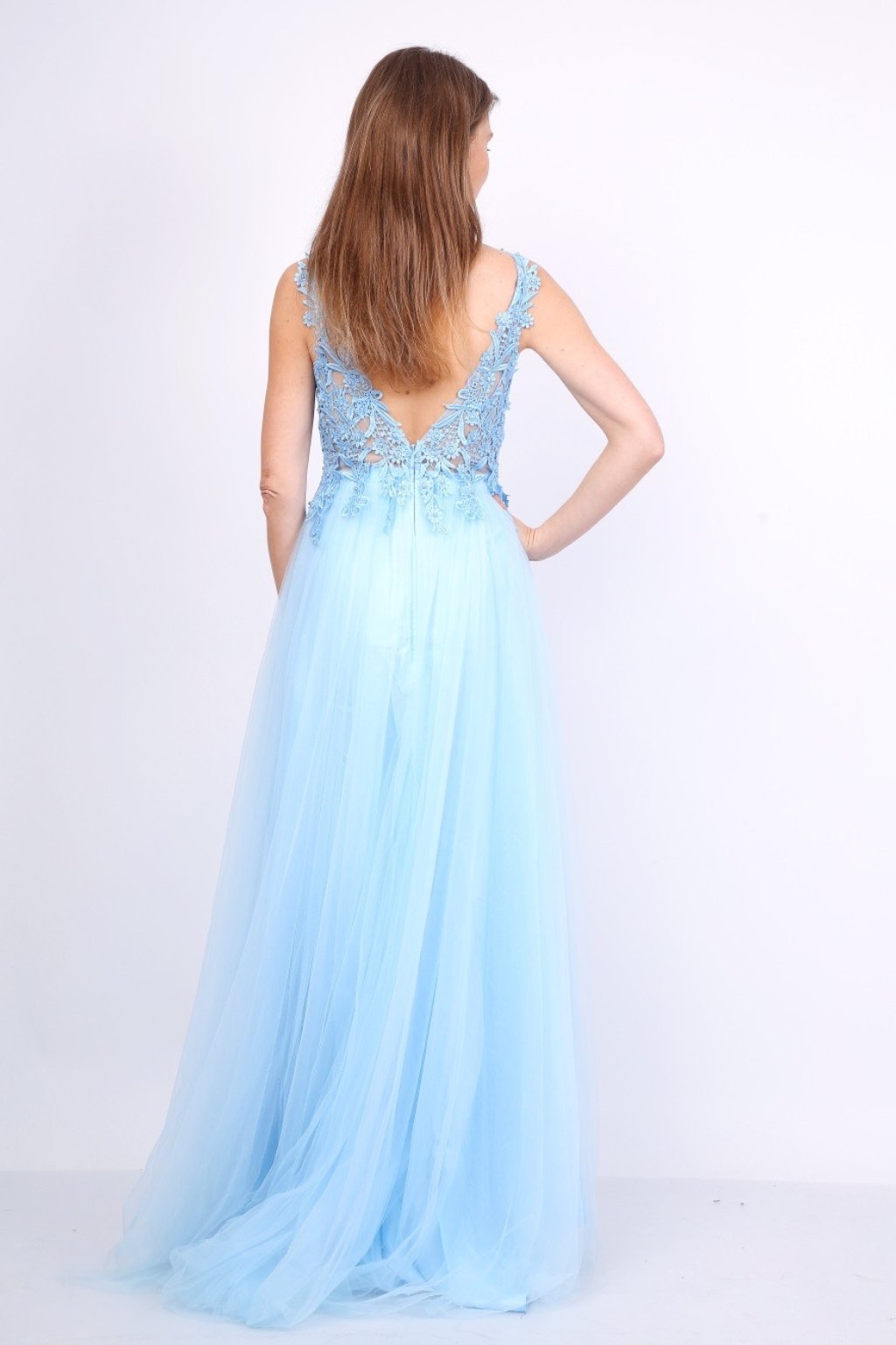 Nežné svetlomodré spoločenské šaty spájajú eleganciu a romantiku v jednom modeli. Čipkovaný vrch s hlbokým výstrihom do V pôsobí veľmi žensky, zatiaľ čo dlhá tylová sukňa s rozparkom dodáva šatám ľahkosť a moderný vzhľad. Tieto šaty sú ideálne na ples, stužkovú, svadbu alebo slávnostný večierok.