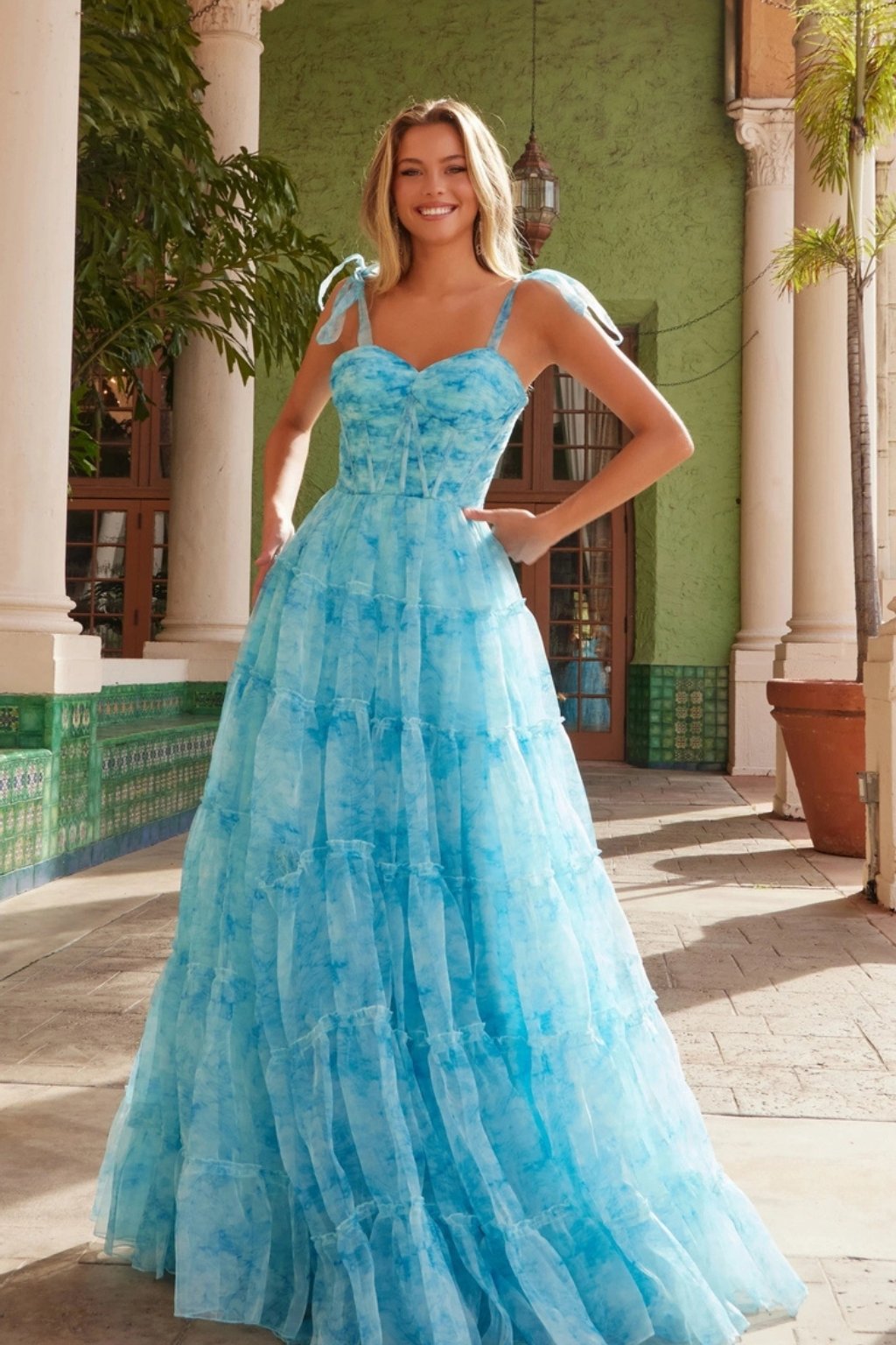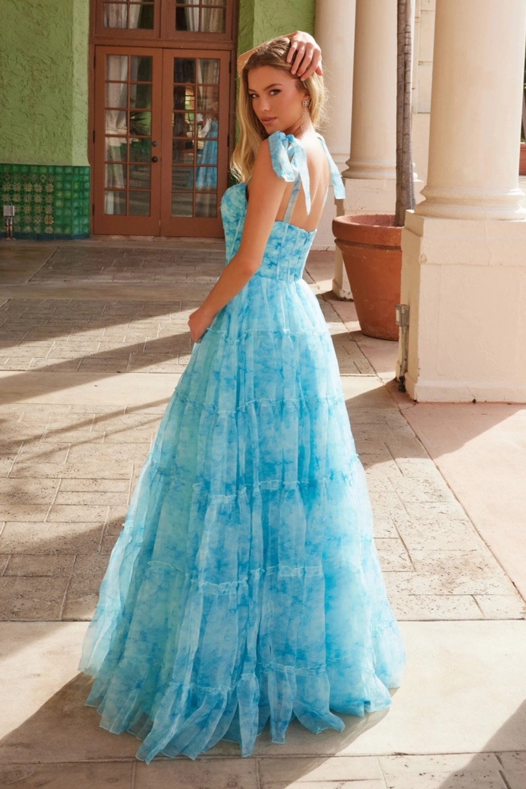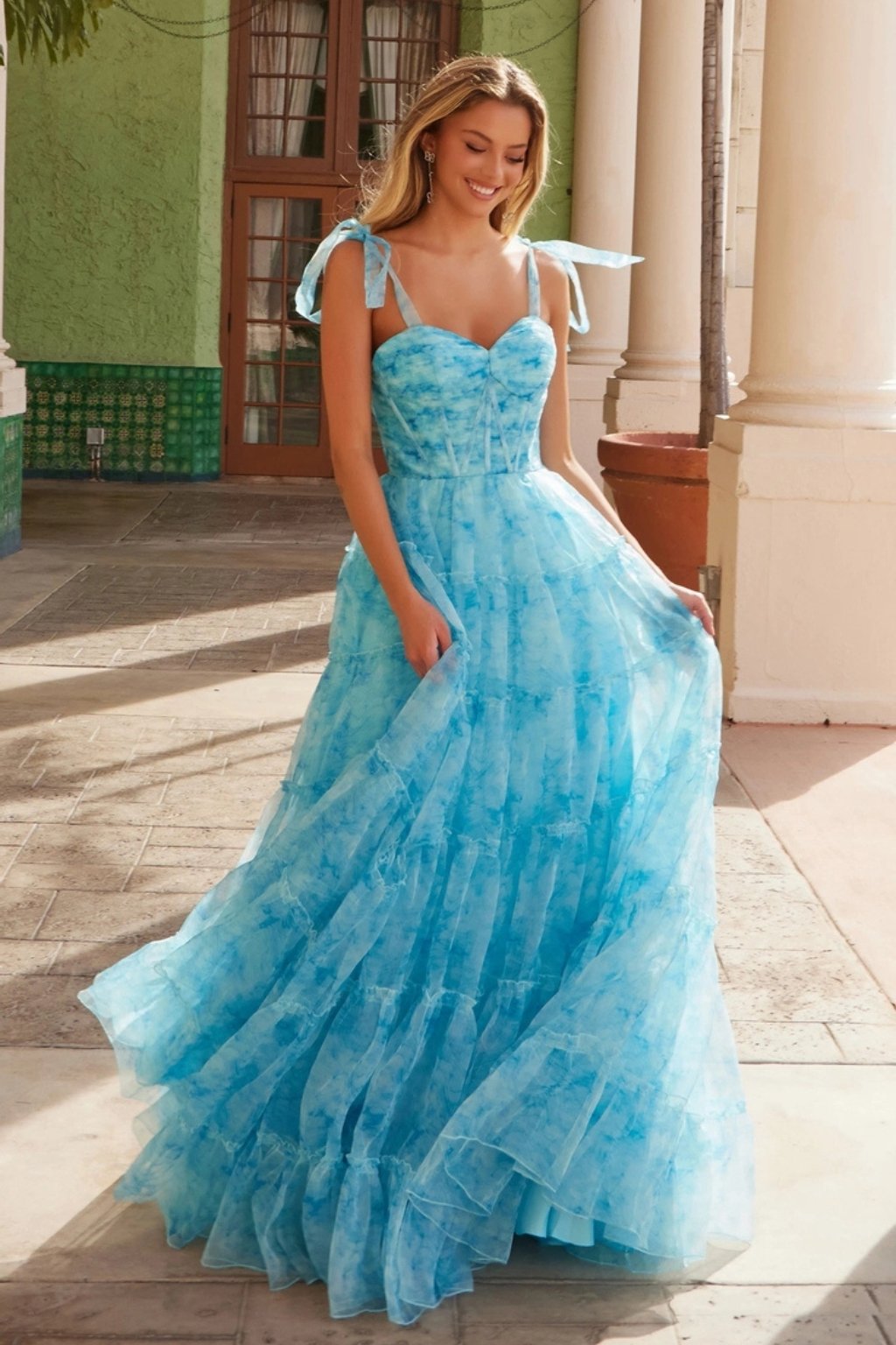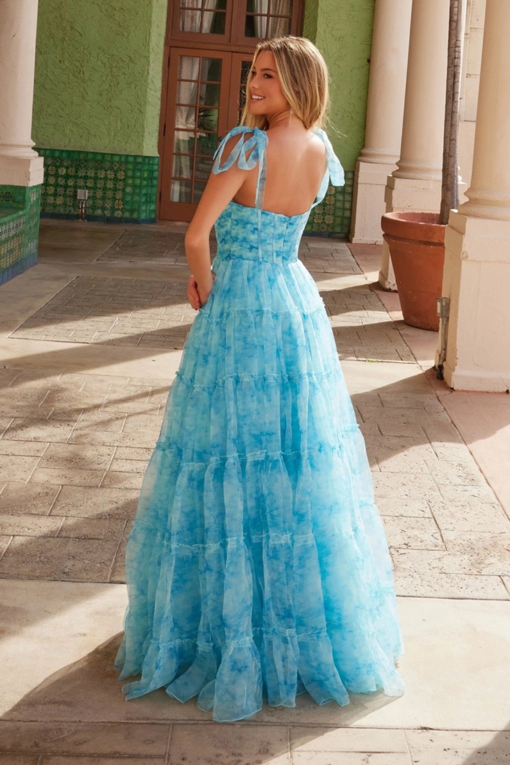 Dlhé modré spoločenské šaty v romantickom A-line strihu očaria ľahkou, viacvrstvovou sukňou po zem s akvarelovým efektom a viazačkami na ramenách, kým vrch so srdiečkovým výstrihom pôvabne zvýrazní dekolt a pás. Tento model je ideálny ako šaty na stužkovú, ples, svadbu, večerné šaty či elegantné šaty na oslavu. Vďaka vzdušnému materiálu a žiarivej obloho-modrej farbe patria medzi najvyhľadávanejšie dlhé šaty, plesové šaty, šaty na stužkovú aj šaty na ples..