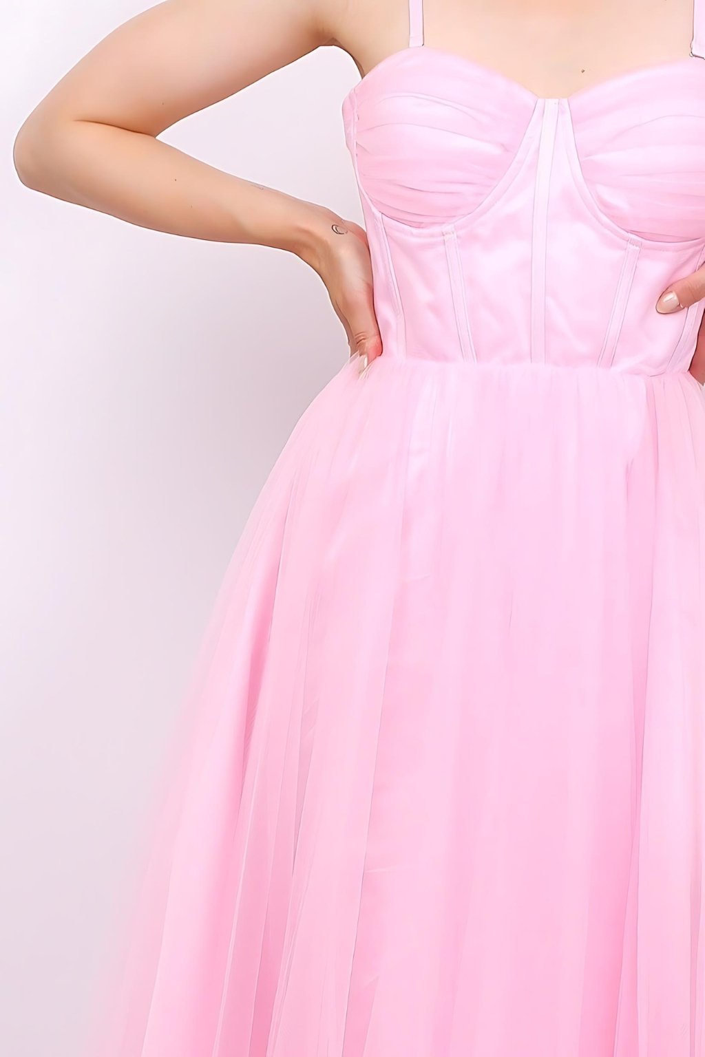 Romantické bledoružové spoločenské šaty s jemnou tylovou sukňou pôsobia nežne a zároveň elegantne. Korzetový vrch so štruktúrovaným prevedením krásne zvýrazní postavu, zatiaľ čo voliteľné ramienka a decentný rozparok na sukni dodávajú modelu moderný a praktický detail. Ideálne na ples, stužkovú, svadbu či slávnostnú oslavu, kde chcete zažiariť štýlom aj eleganciou.