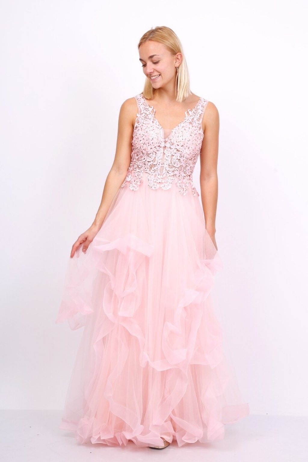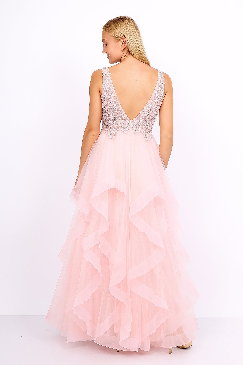 Romantické ružové spoločenské šaty očaria jemným čipkovaným vrchom zdobeným kamienkami, ktorý pôsobí luxusne a ženský. Tylová sukňa s volánmi dodáva šatám ľahkosť a šarm, pričom ich dlhý strih je ideálny na slávnostné príležitosti. Perfektná voľba na ples, stužkovú alebo svadbu.