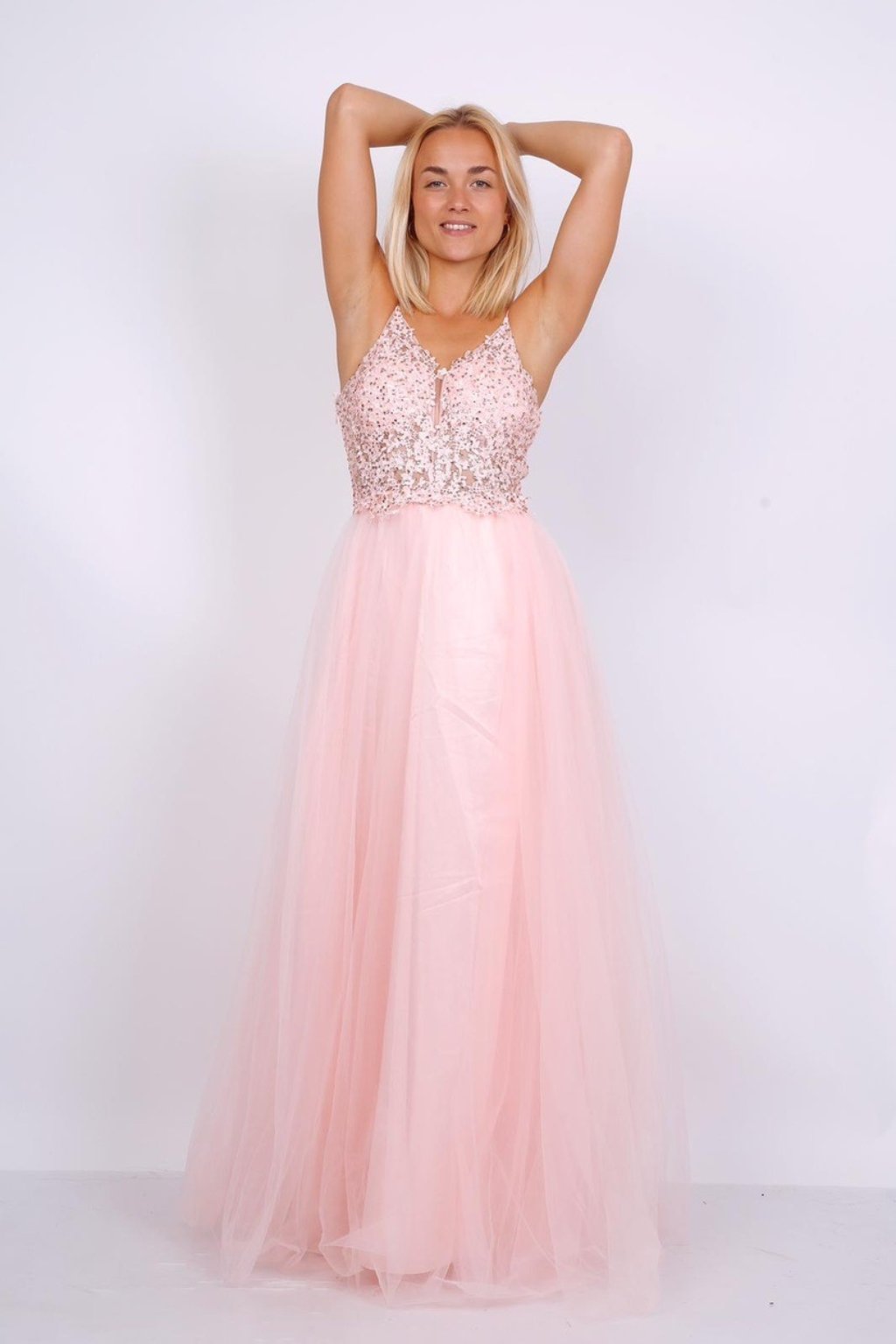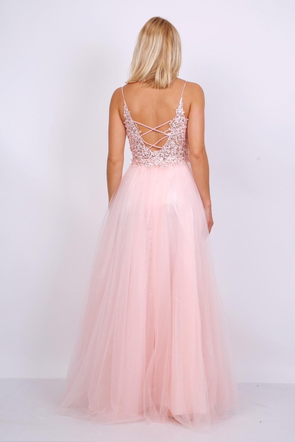 Tieto dlhé ružové spoločenské šaty na tenké ramienka vynikajú trblietavým vrchom zdobeným flitrami a jemnou, vzdušnou tylovou sukňou, ktorá pôsobí étericky a elegantne. Šaty majú odhalený chrbát so zaujímavo kríženými šnúrkami, ktoré vytvárajú jemný, no efektný detail. Tento romantický model je ideálny na stužkovú, svadbu, pre nevestu ako popolnočné šaty, večierok alebo ako šaty pre družičku.