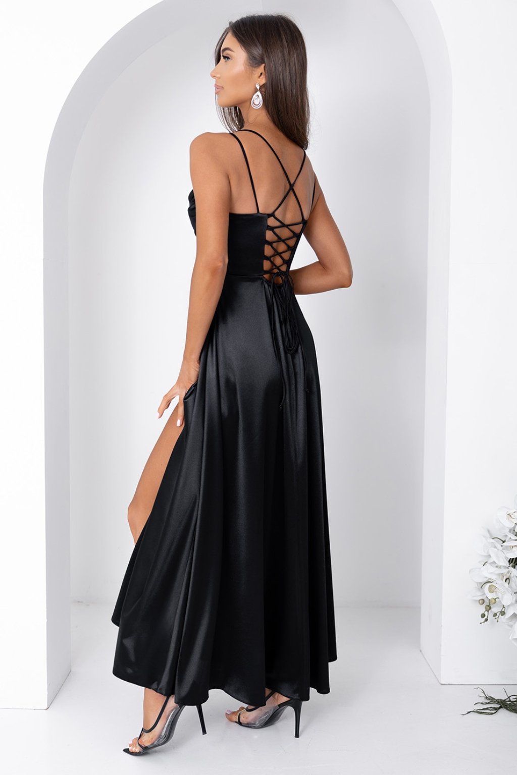 Dlhé čierne saténové spoločenské šaty s ramienkami, rozparkom a šnurovaním na chrbte