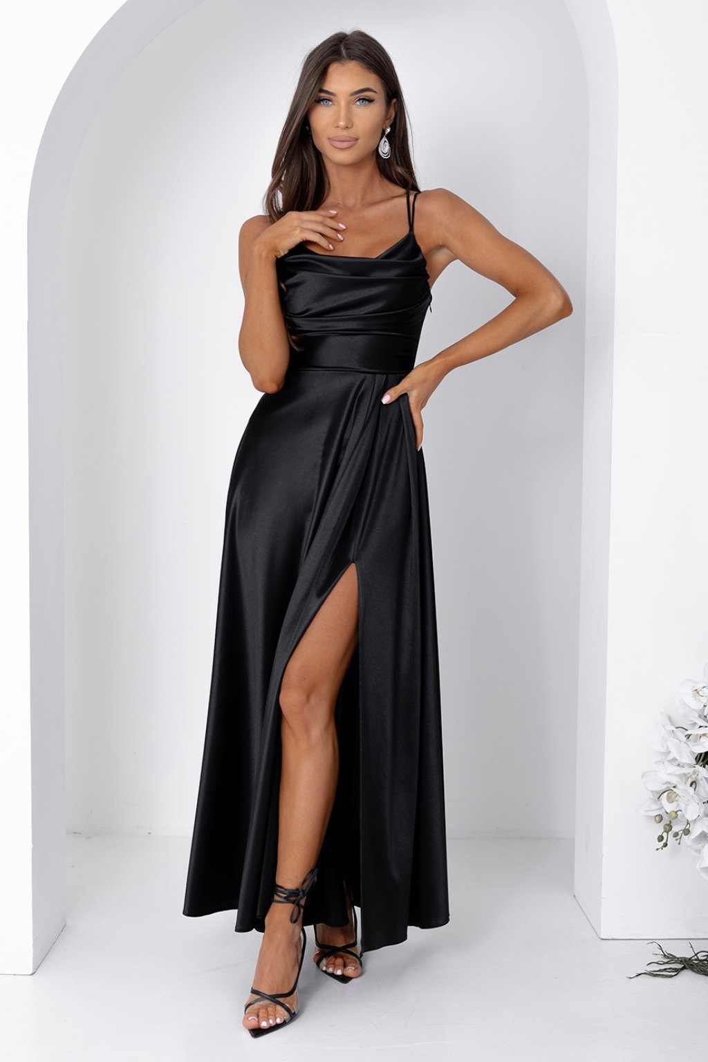 Tieto dlhé čierne saténové šaty s tenkými ramienkami sú ideálnou voľbou pre elegantné ženy, ktoré chcú zažiariť na plese, svadbe, stužkovej alebo večierku. Lesklý hladký materiál pôsobí luxusne, zatiaľ čo nariasený vrch, šnurovanie na chrbte a hlboký rozparok na nohe zvýrazňujú ženskú postavu. Šaty majú pohodlné ramienka a jemnú gumičku v páse, ktorá zaručuje komfortné nosenie a dokonalé prispôsobenie postave.