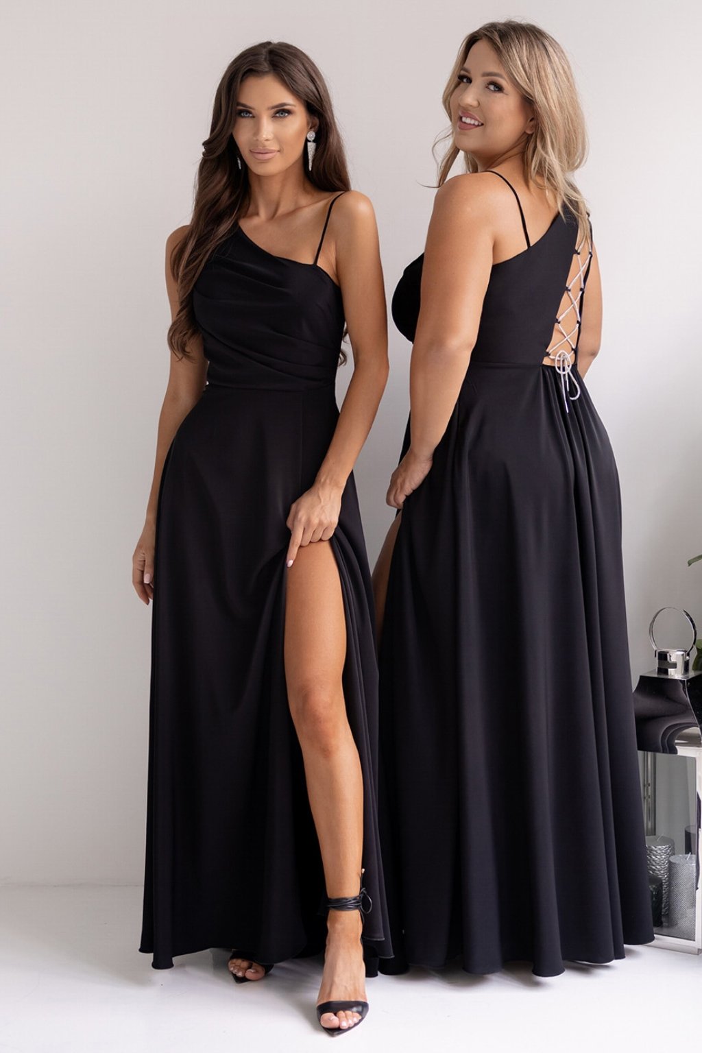 Tieto dlhé čierne spoločenské šaty s asymetrickým vrchom a jedným ramienkom očaria svojou eleganciou a moderným dizajnom. Šaty sú na viazanie, v oblasti pása majú praktickú gumičku pre dokonalé prispôsobenie postave a súčasťou balenia je aj jednoduchá šnurovačka, ktorú si viete vymeniť podľa príležitosti. Vysoký rozparok na nohe, jemne rozšírená sukňa a trblietavé detaily na chrbte robia z týchto šiat ideálnu voľbu na ples, stužkovú, svadbu, oslavu či večierok.
