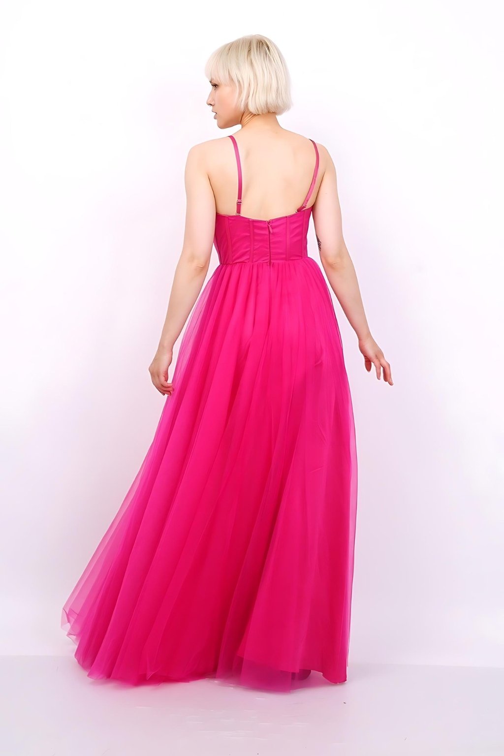 Romantické fuchsiové spoločenské šaty s jemnou tylovou sukňou pôsobia nežne a zároveň elegantne. Korzetový vrch so štruktúrovaným prevedením krásne zvýrazní postavu, zatiaľ čo voliteľné ramienka a decentný rozparok na sukni dodávajú modelu moderný a praktický detail. Ideálne na ples, stužkovú, svadbu či slávnostnú oslavu, kde chcete zažiariť štýlom aj eleganciou.