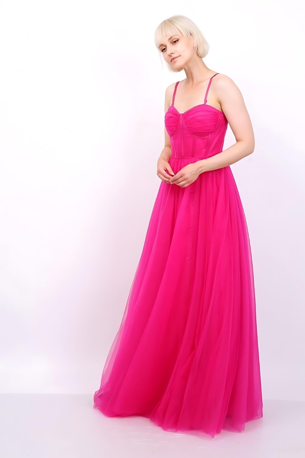Dlhé fuchsiové korzetové šaty s tylovou sukňou
