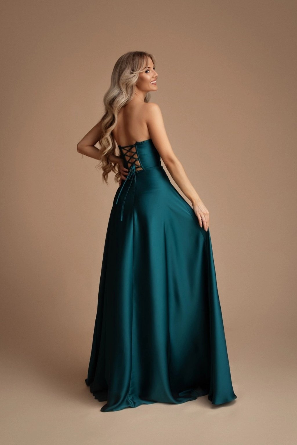 Dlhé petrolejové saténové spoločenské šaty s výrazným rozparkom sú ideálne na ples, stužkovú, svadbu alebo galavečer. Elegantný korzetový vrch je krásne tvarovaný, má vystužený hrudník a vzadu šnurovanie, ktoré zaručí dokonalé prispôsobenie postave. Šaty majú odnímateľné ramienka, takže si ich môžete prispôsobiť.