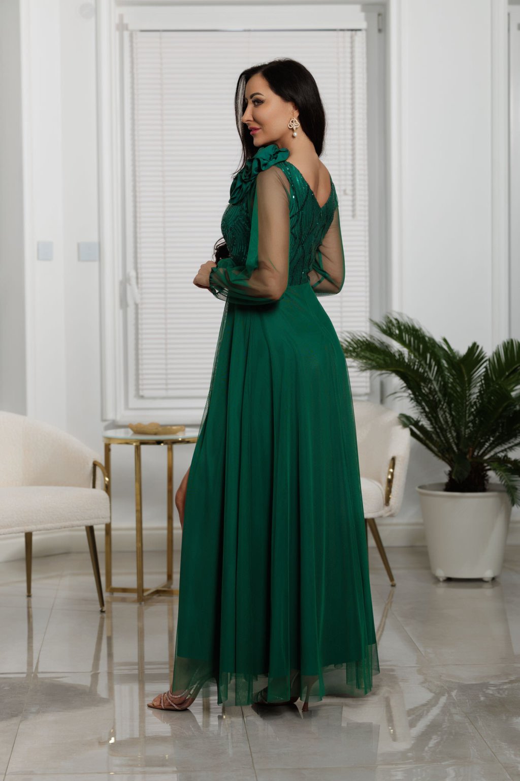 Elegantné dlhé spoločenské šaty v smaragdovo zelenej farbe zaujmú na prvý pohľad svojím trblietavým vrchom zdobeným flitrami a originálnou 3D kvetinou na ramene. Priehľadné dlhé rukávy z jemného tylu dodávajú modelu romantický nádych, zatiaľ čo hlboký rázpor na sukni krásne predĺži nohy. Tento model je ideálny na ples, svadbu, večierok alebo stužkovú, no vynikne aj ako výrazný outfit na slávnostnú oslavu.