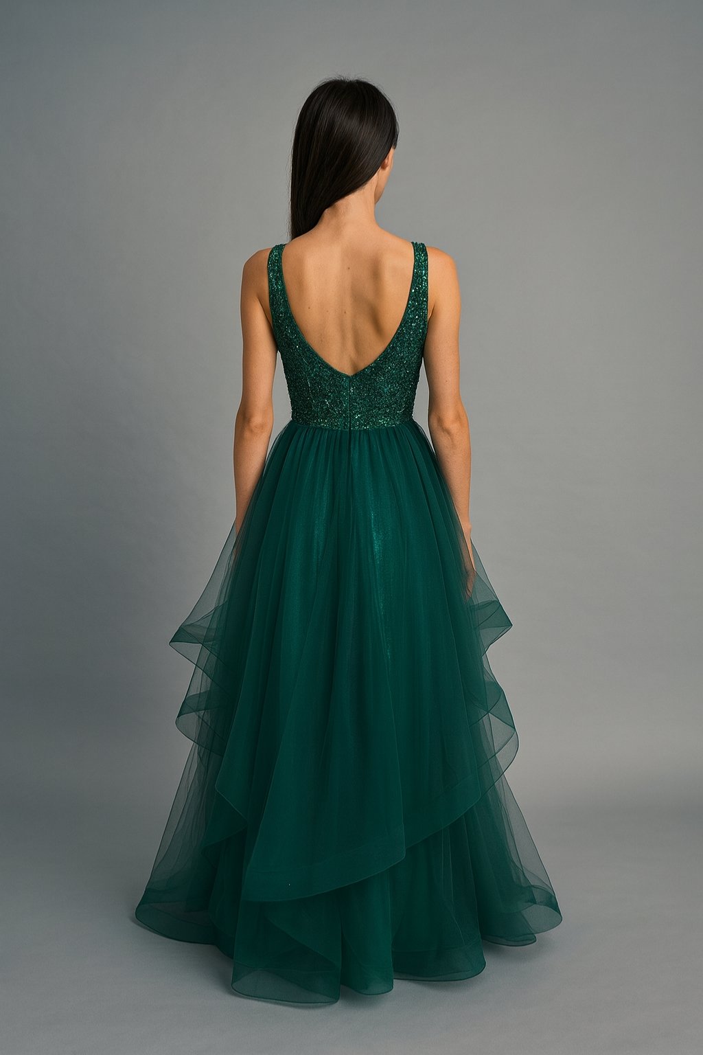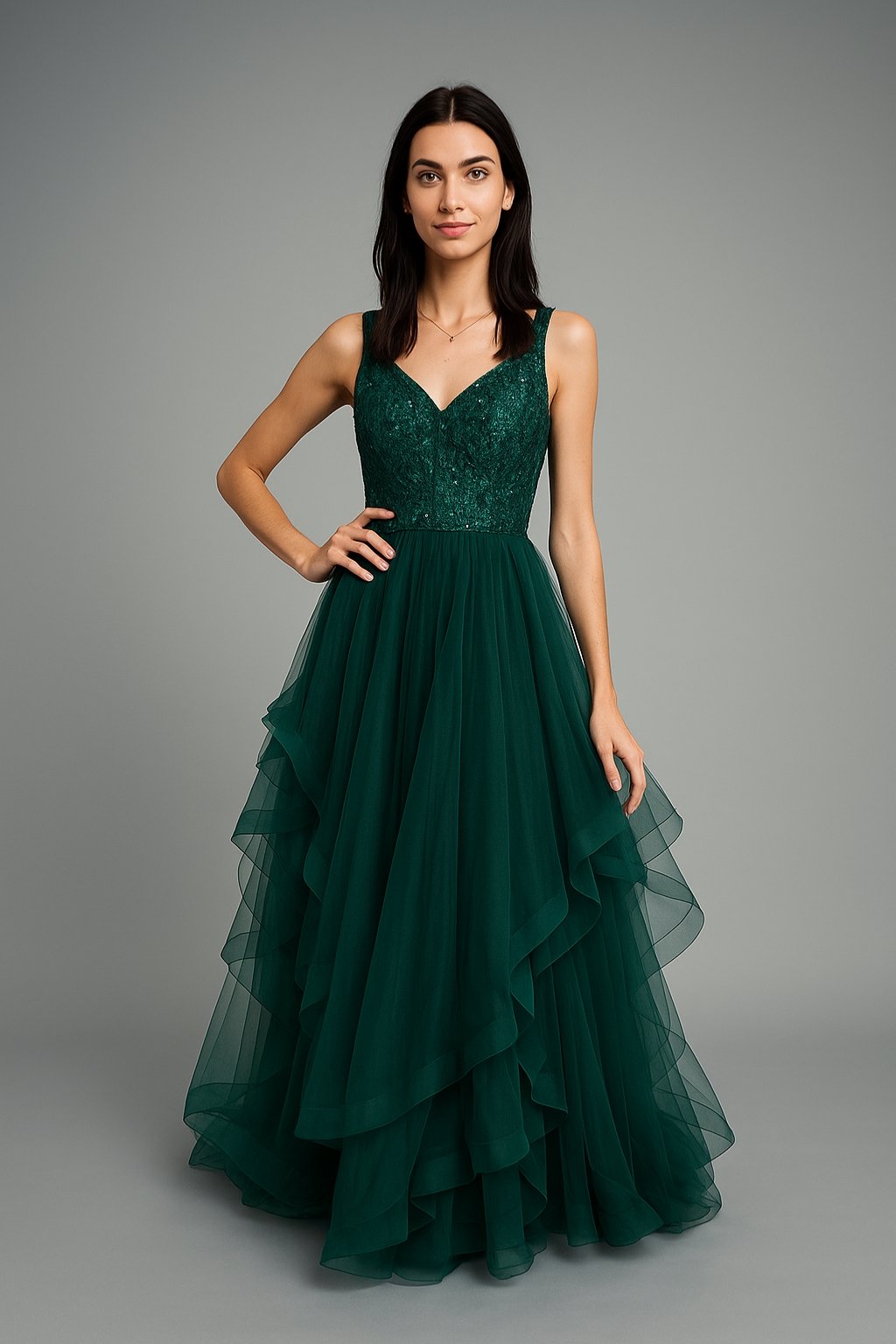 Noblesné dlhé zelené spoločenské šaty očaria každú ženu svojím trblietavým vrchom zdobeným flitrami a bohatou tylovou sukňou s volánmi. Širšie ramienka a hlbší výstrih dodávajú modelu elegantný, no pohodlný vzhľad. Perfektná voľba na ples, stužkovú, svadbu či galavečer.